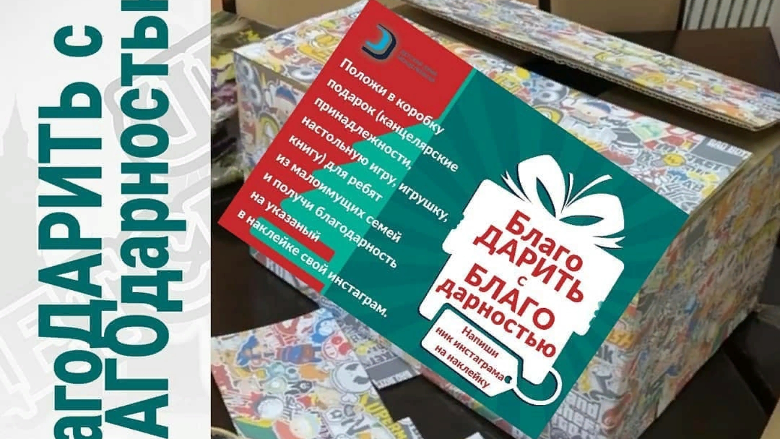 Если ты хочешь помочь, то положи в коробку подарок (канцелярские принадлежности, настольную игру, игрушку, книгу) для ребят из малоимущих семей и получи благодарность на указанный в наклейке свой инстаграм.