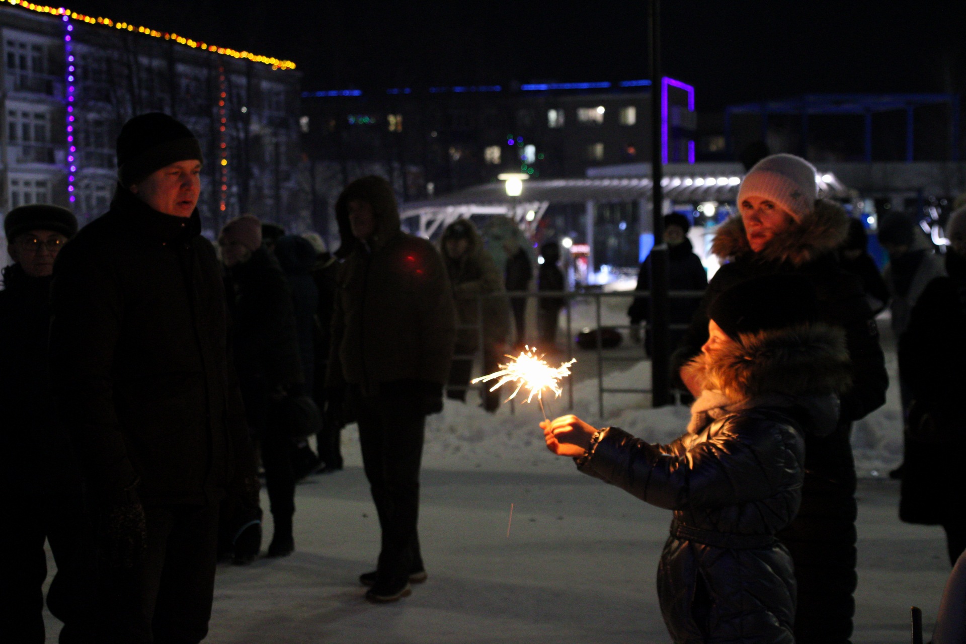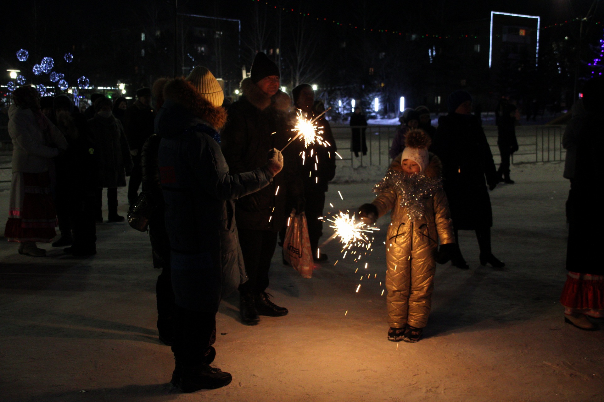 Горожане делали памятные фото с новыми иллюминациями, которые украшали площадь ДК им.С.Гассара и парк "Дружба", танцевали, пели песни, зажигали бенгальские огни и поздравляли друг друга с наступающим Новым годом.