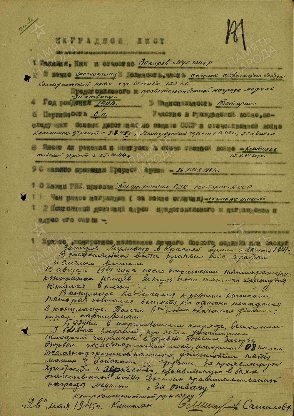 Документы Министерства обороны РФ, выложенные на сайте «Память народа», позволяют восстановить невероятную хронику фронтового пути земляка. Мулланур попал в самое пекло первых дней войны и оказался в плену в августе 1941 года. О том, какие испытания довелось ему пережить, рассказывается в наградном листе к медали «За отвагу» (фронтовой приказ от 10.06.1945 г.): «15 августа 1941 года после отражения пятикратных контратак немцев Закиров после тяжелой контузии остался в плену. В концлагере подвергался разным пыткам, пять раз пытался бежать, но попадал обратно в концлагерь. Только шестой побег оказался удачным, попал к партизанам. Будучи в партизанском отряде, выполнил 9 боевых заданий, при этом уничтожил немецкий гарнизон в деревне Большое Загорье, взорвал железнодорожный мост, испортил 0,8 км железнодорожного полотна, уничтожил пять машин с войсками и грузом. Достоин правительственной награды медали «За отвагу». Это была его вторая медаль «За отвагу». Первую он получил 8 апреля 1944 года за то, что первым поднялся в атаку, увлекая бойцов, ворвался в траншеи немцев в районе разъезда Баженово, Псковского района, уничтожив две огневые точки и 7 немецких солдат и офицеров, – сказано в наградном листе.