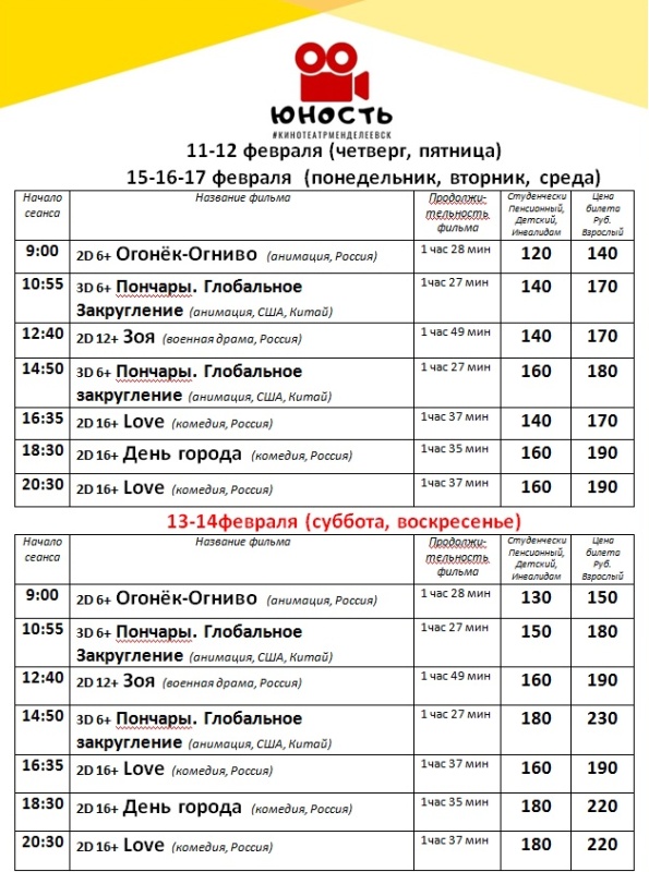 Расписание кинофильмов в кинотеатре «Юность» с 11 по 17 февраля