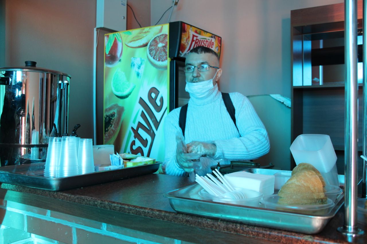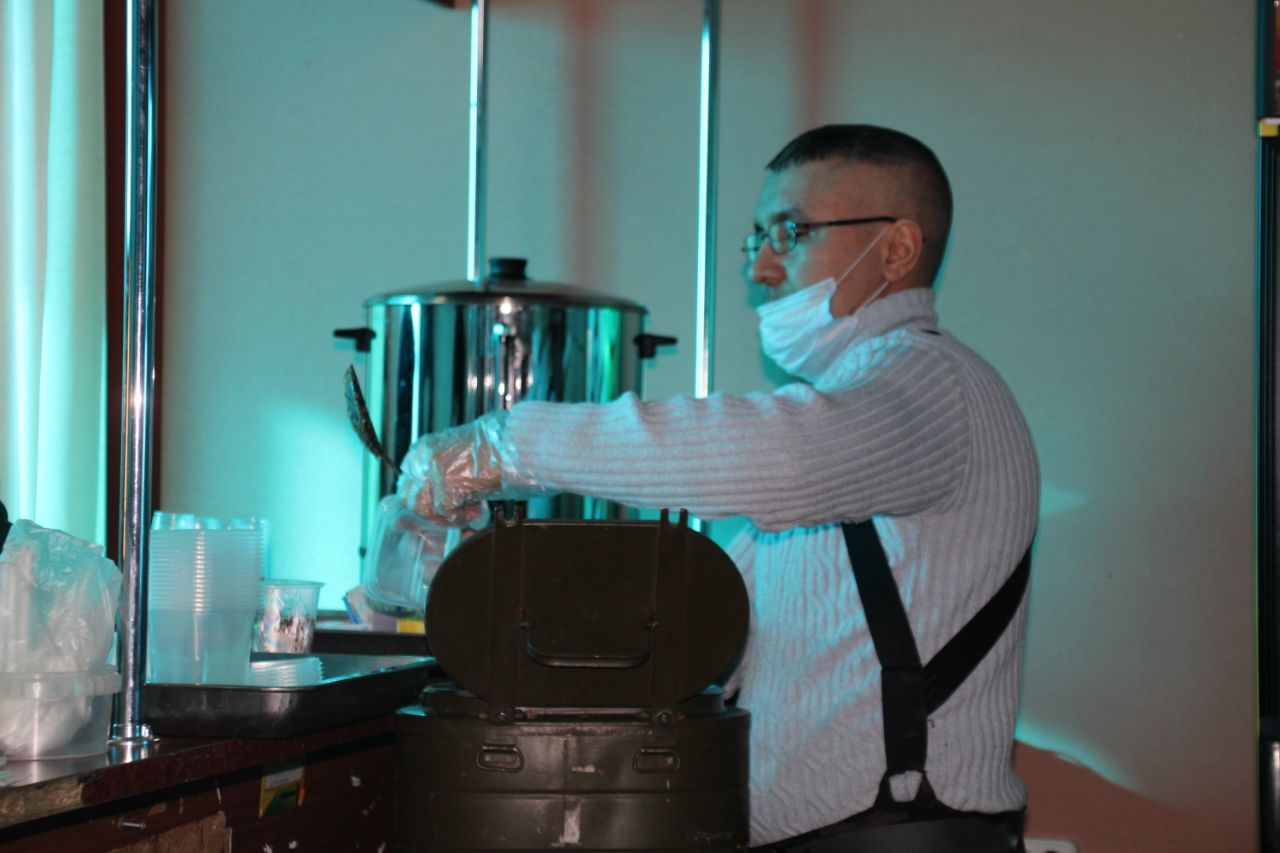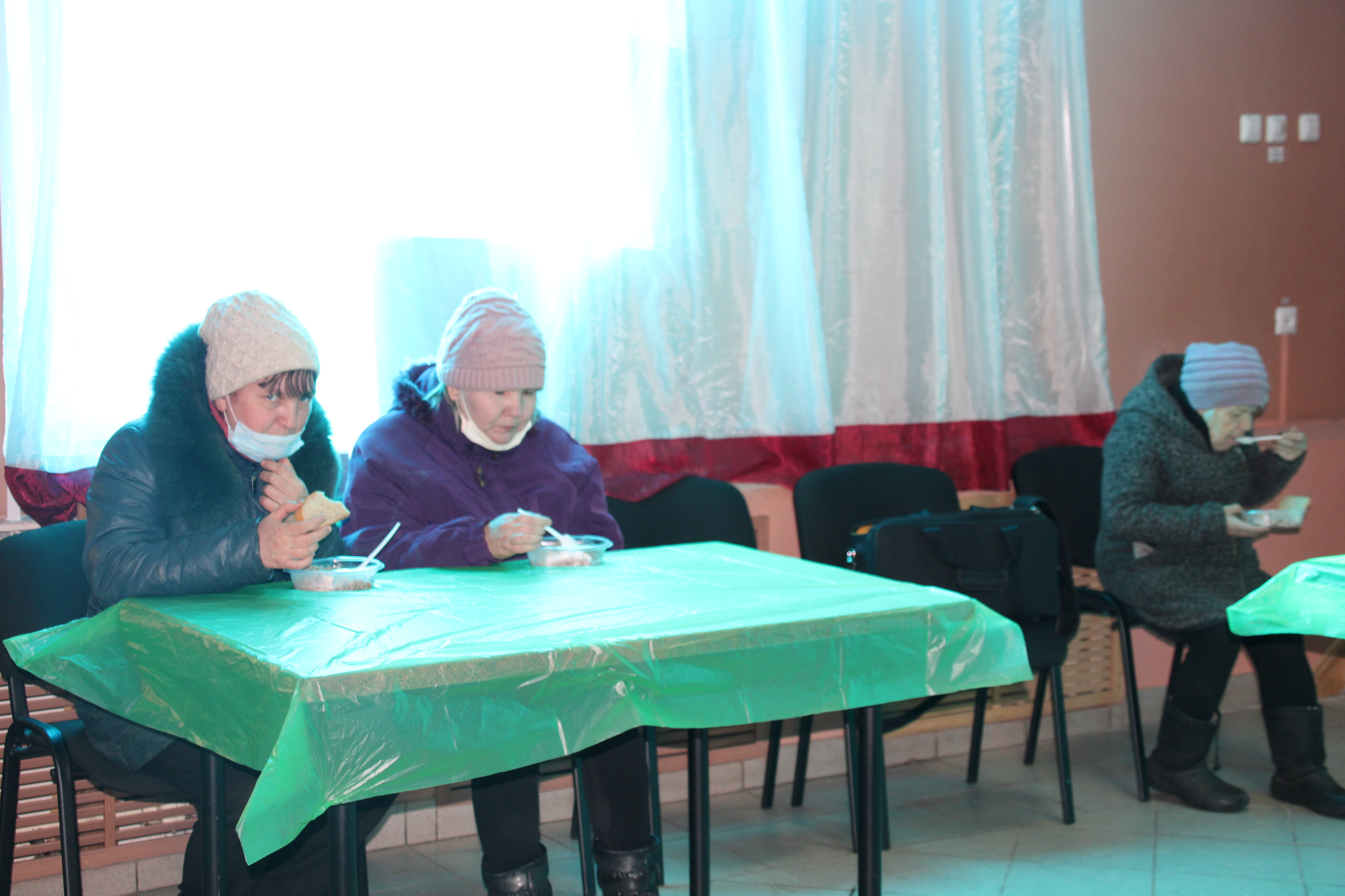 45 человек ,приглашенные председателями ТОСов, в РДК "Юность" могли поесть горячую кашу, попить чай, взять маски и еду в контейнерах домой.