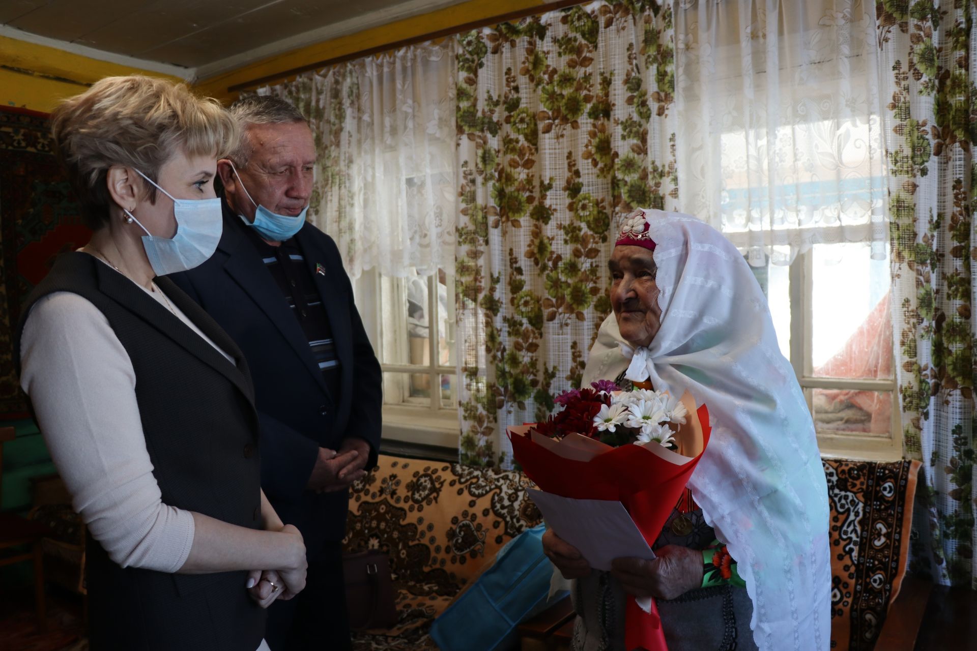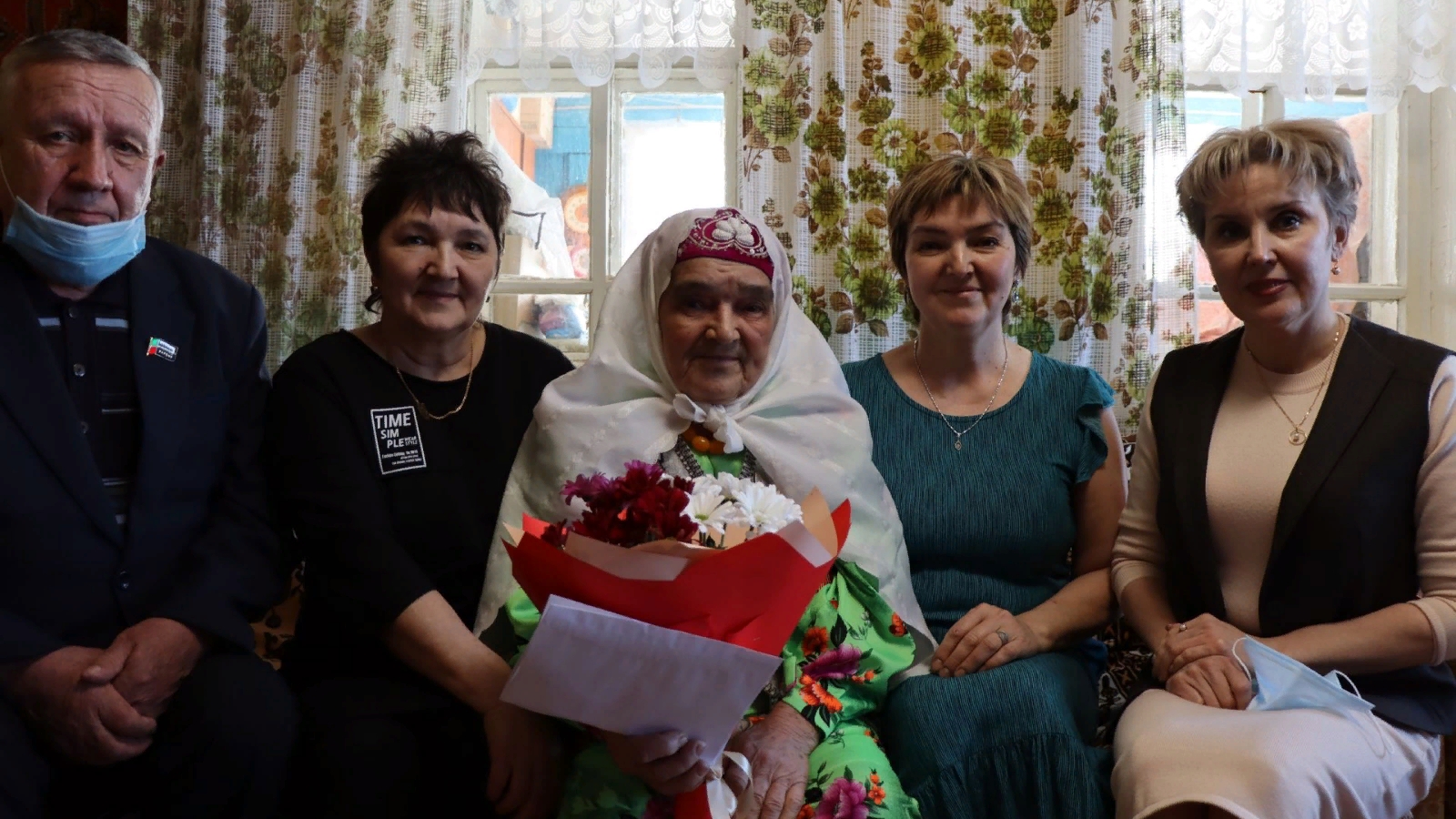 Юбиляра посетили заместитель главы района Лейсан Галеева, глава Енабердинского поселения Евгений Никифоров, вручили ей именные открытки, цветы и памятный подарок