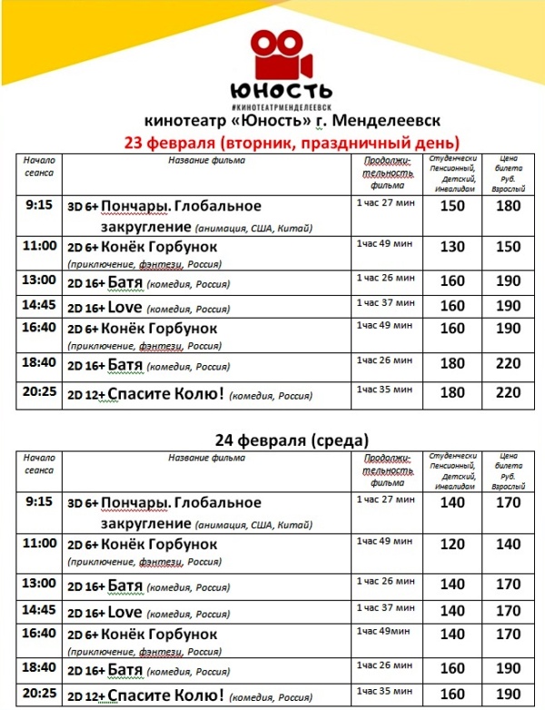 Расписание кинофильмов в кинотеатре «Юность» с 18 по 24 февраля
