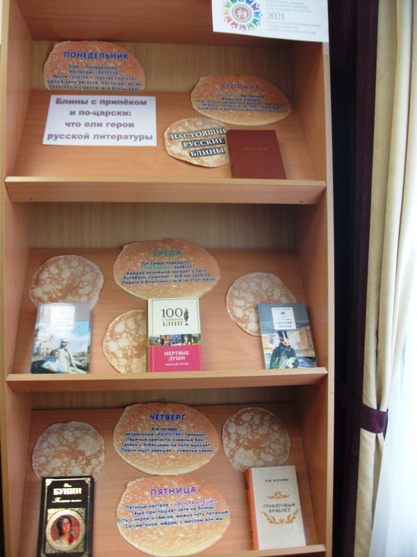 13 марта в Тат. Челнинской сельской библиотеке все посетители могли воспользоваться рецептами не из поваренных книг, а героев классической литературы, представленных на выставке «Блины с припёком и по-царски: что ели герои русской литературы».