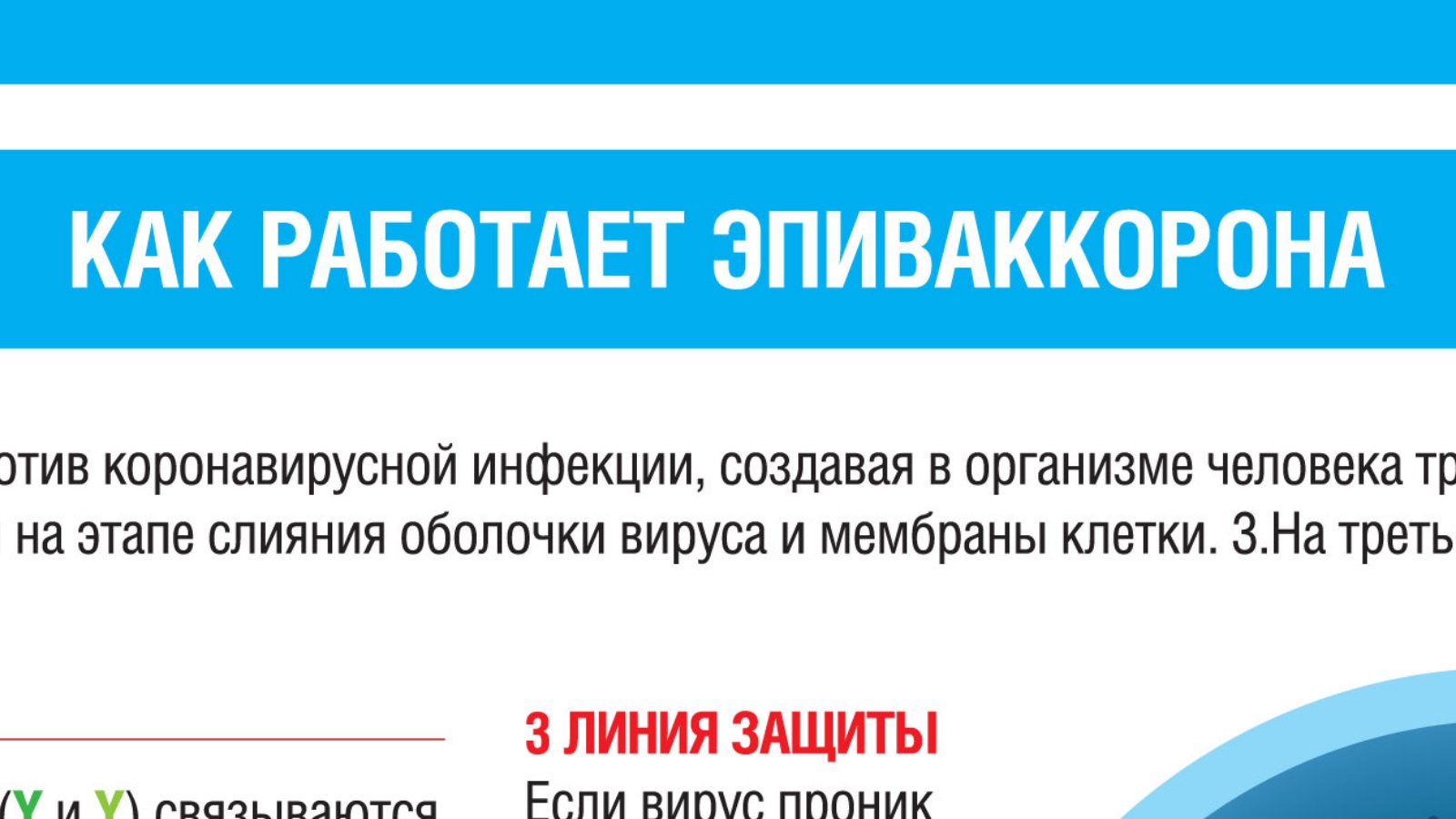 «ЭпиВакКорона» формирует три линии иммунной защиты. Первую линию защиты формируют антитела, нацеленные на пептид, входящий в состав рецептор-связывающего домена вирусного S-белка. Антитела, связавшиеся с данным районом, препятствуют взаимодействию с клеточным рецептором.