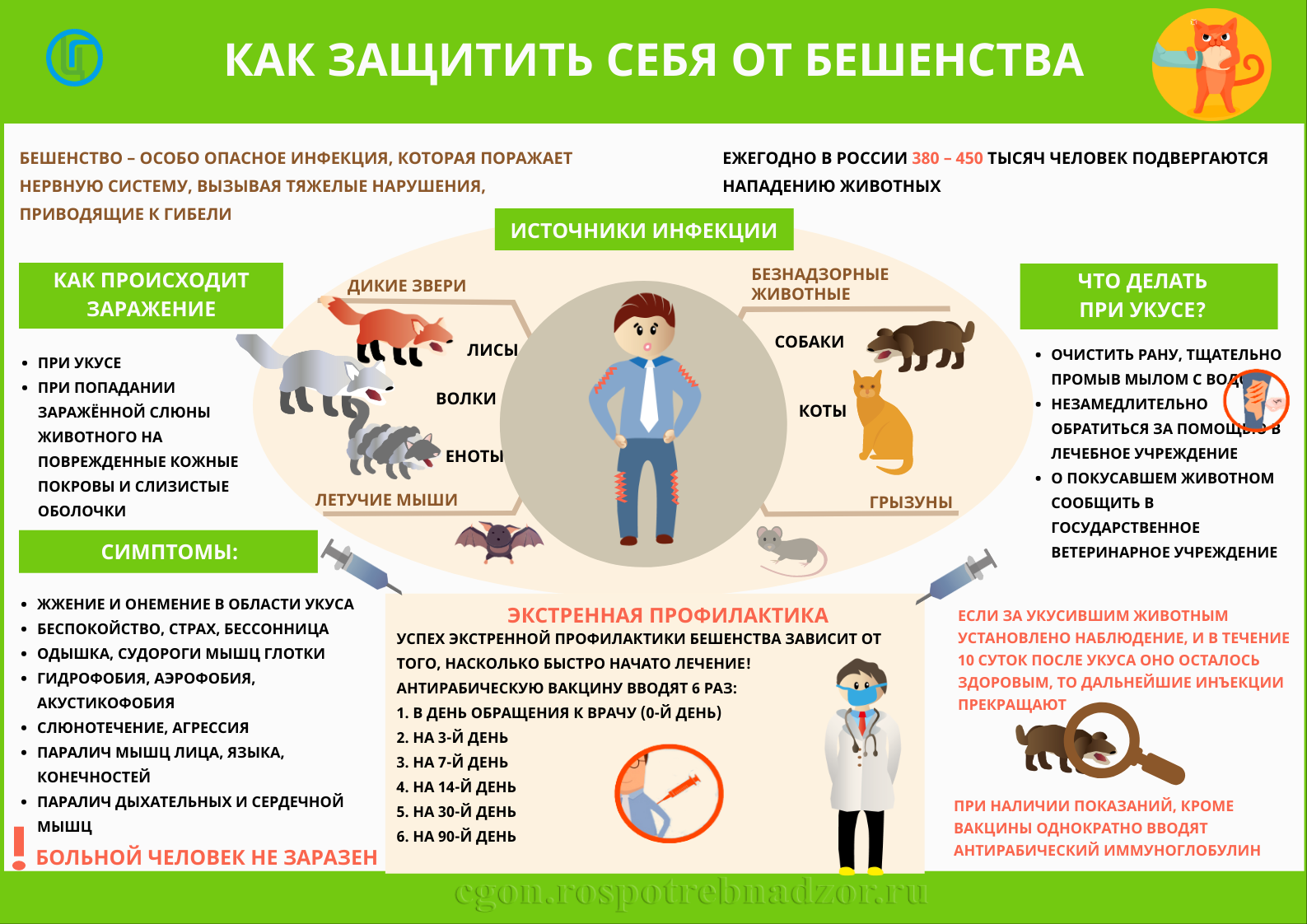 Основным источником инфекции для человека являются собаки, в первую очередь - безнадзорные, а из диких животных - лисы, енотовидные собаки, волки. Возможно заражение человека и от других животных - коров, овец, коз, свиней, лошадей, ослов, крыс, ежей, летучих мышей и др. Основным резервуаром вируса в природе являются лисицы, волки, енотовидные собаки, среди которых возникают спонтанные эпизоотии бешенства. Заражение человека наступает при укусе больным животным, а также вследствие ослюнения свежих ранений кожи или слизистых оболочек. Особенно опасны укусы в голову, лицо, кисти рук. Животные становятся заразными для людей уже в конце инкубационного периода (до начала проявлений признаков болезни).