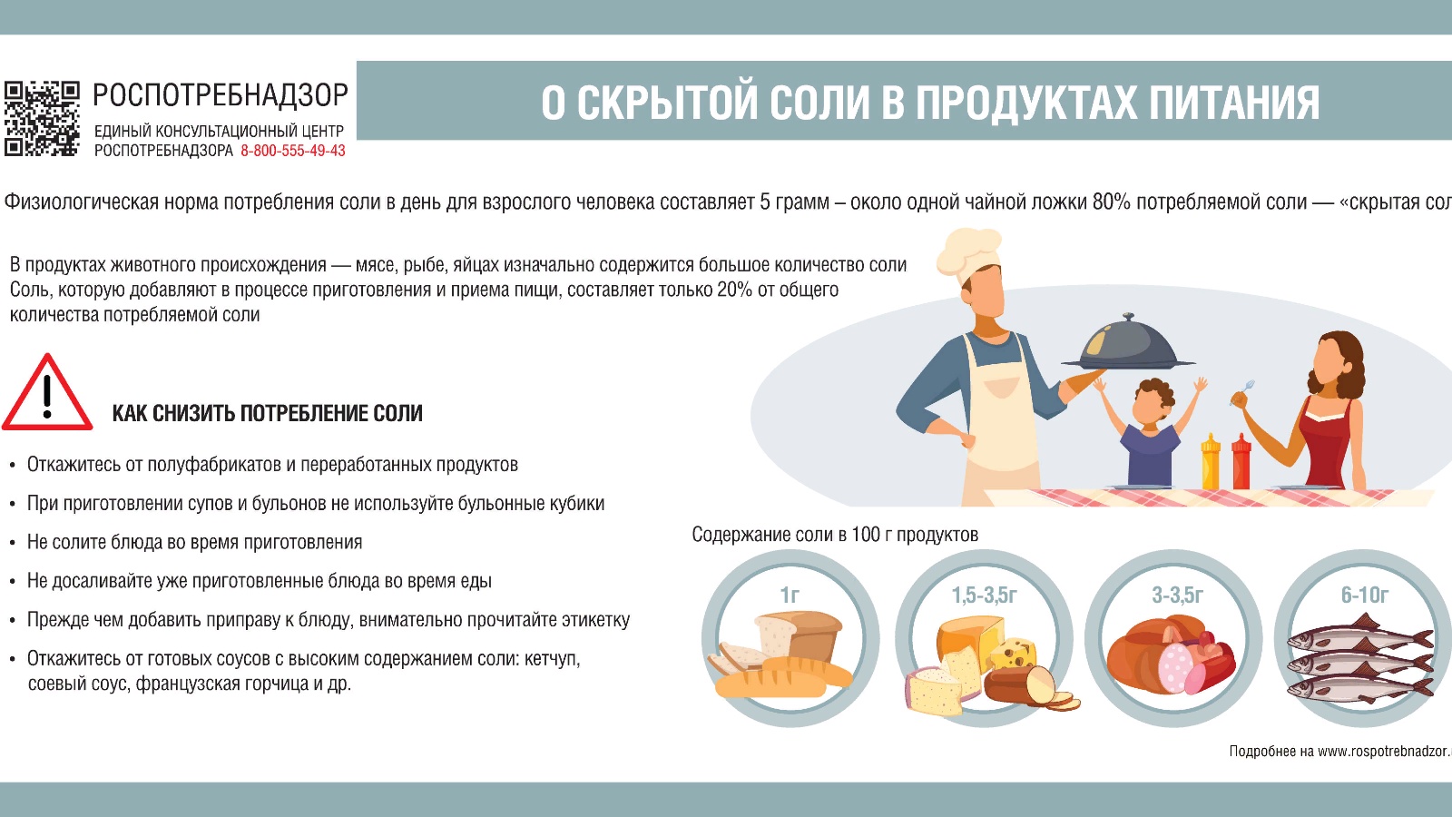 Роспотребнадзор напоминает, что физиологическая норма потребления соли в день для взрослого человека составляет 5 грамм – около одной чайной ложки. Именно такое количество соли нужно организму для поддержания водно-минерального баланса, проведения нервных импульсов и работы мышц.