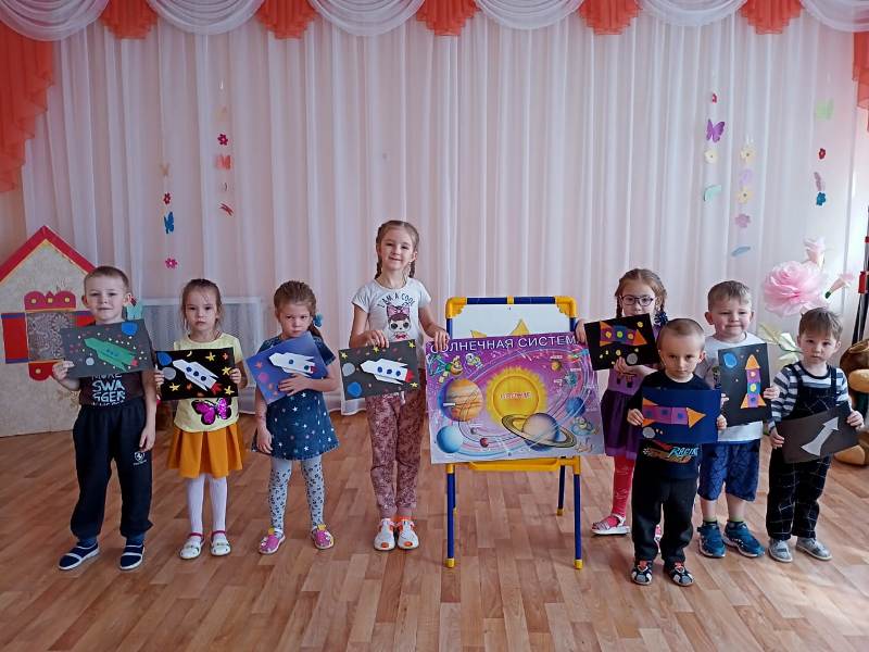 Ребята очень увлечённо слушали рассказ о первом космонавте Ю.А. Гагарине. Обыкновенный мальчик, шустрый, весёлый и любознательный, долетел до звёзд и вернулся. Мечта людей о полёте в космос сбылась. Дети тоже побывали в космосе, узнали о солнце и других планетах солнечной системы, увидели, как выглядит из космоса наша Земля, поучаствовали в спортивных играх, порисовали, отвечали на вопросы викторины, отгадывали загадки и с интересом рассматривали книги.