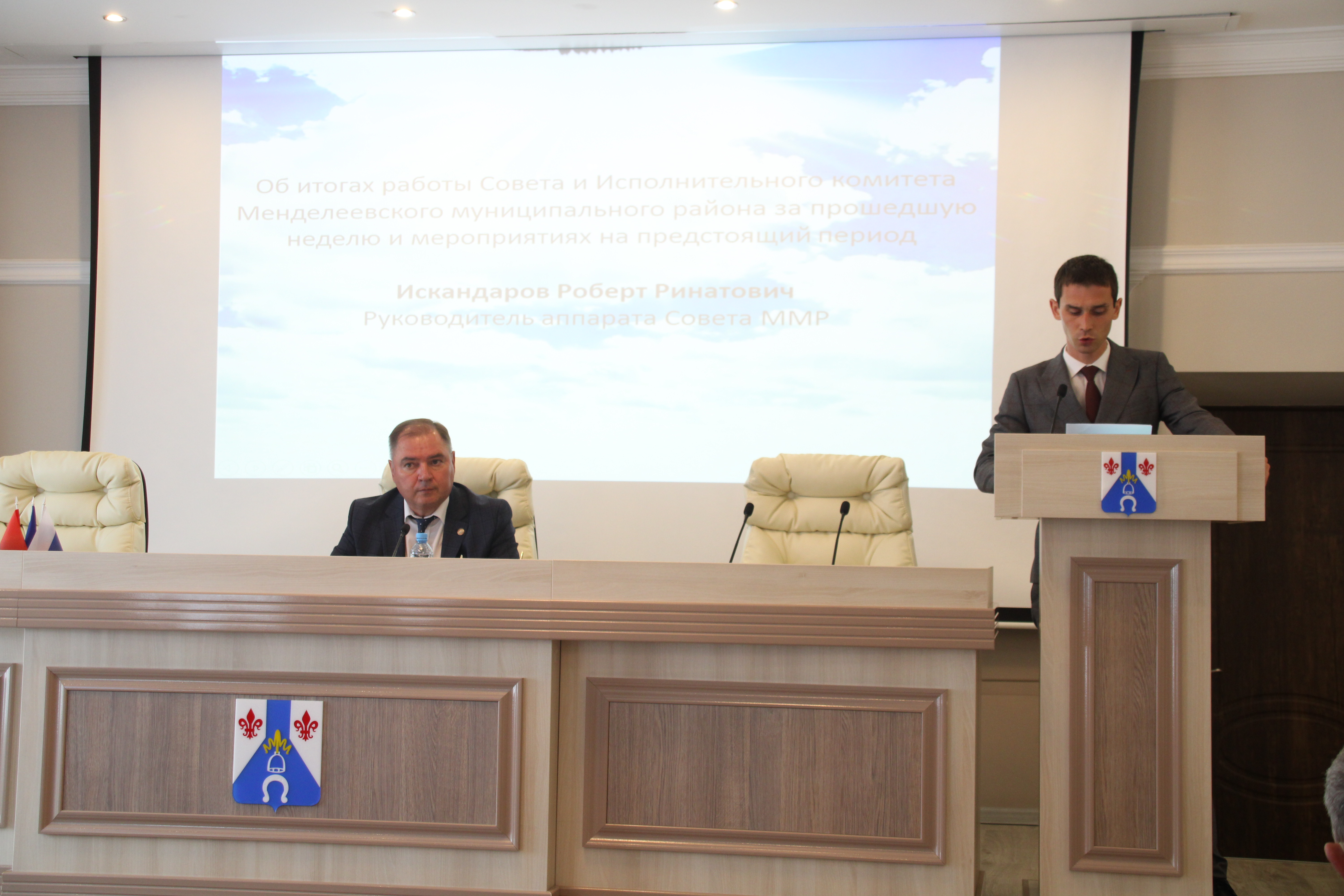 С итогами работы Совета и Исполнительного комитета Менделеевского муниципального района за прошедшую неделю и мероприятиях на предстоящий период выступил Роберт Искандаров – руководитель аппарата Совета ММР.