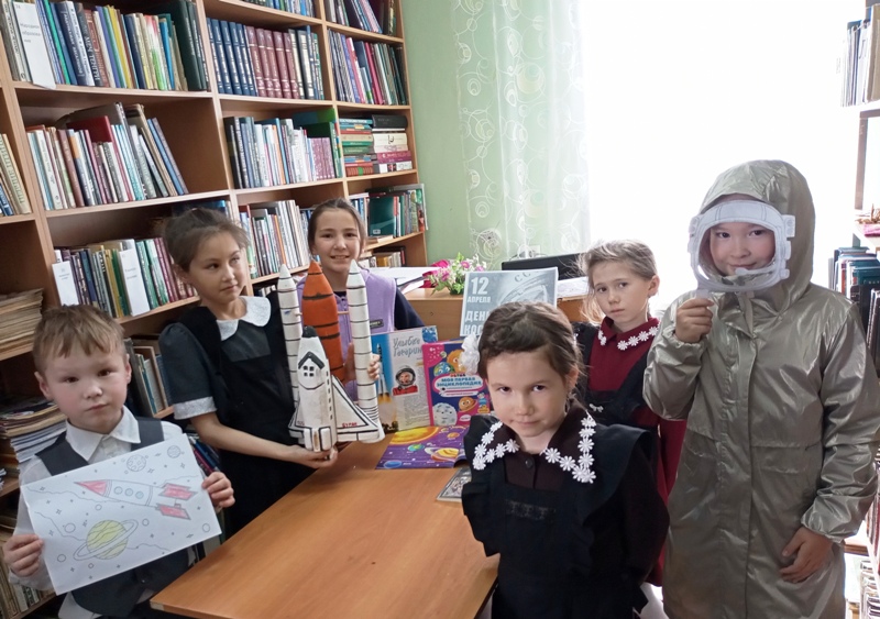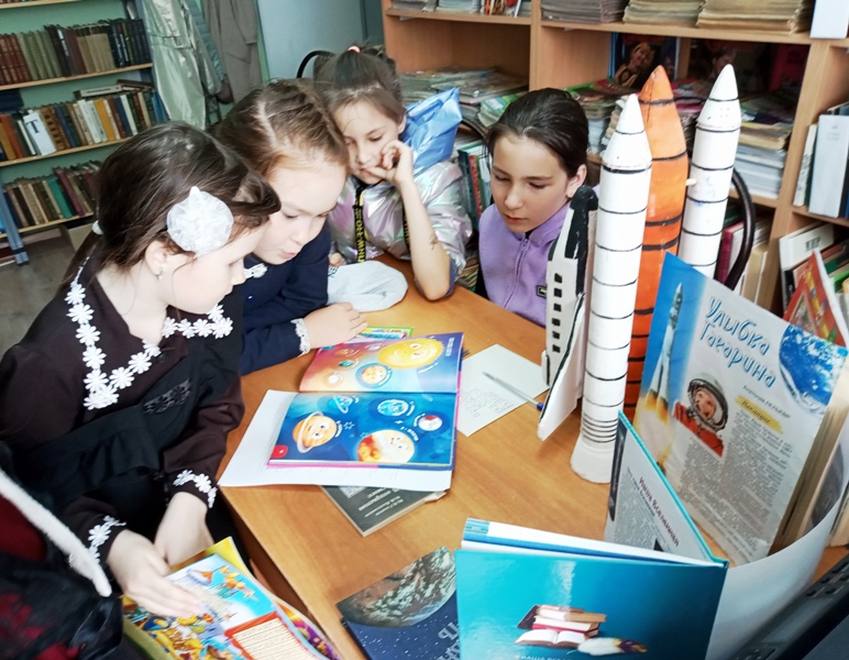 Библиотекарь представила увлекательный рассказ о жизни Ю.А.Гагарина, о подготовке к первому в мире космическому полёту. Дети увлечённо участвовали в викторине, успешно отвечая на вопросы о первом полёте человека в космос, о Солнечной системе, о загадочных звёздах и далёких планетах. Разгадали «космический» кроссворд. Познакомились с книгами, представленными на книжной выставке.