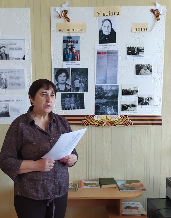 Помня о героических событиях в годы войны, нельзя забывать о трудовых подвигах женщин. Война коснулась и наше село. В годы войны в санатории «Ижминводы» был развернут эвакуационный госпиталь под номером 4639. Многие женщины села работали там. Своим письмом-воспоминанием и фотографиями поделилась с нами Багаутдинова М.К., мать которой ухаживала за ранеными. В библиотеке оформлен стенд по представленным материалам. Подробно о работе госпиталя рассказала директор СДК Пономарева В.Б.