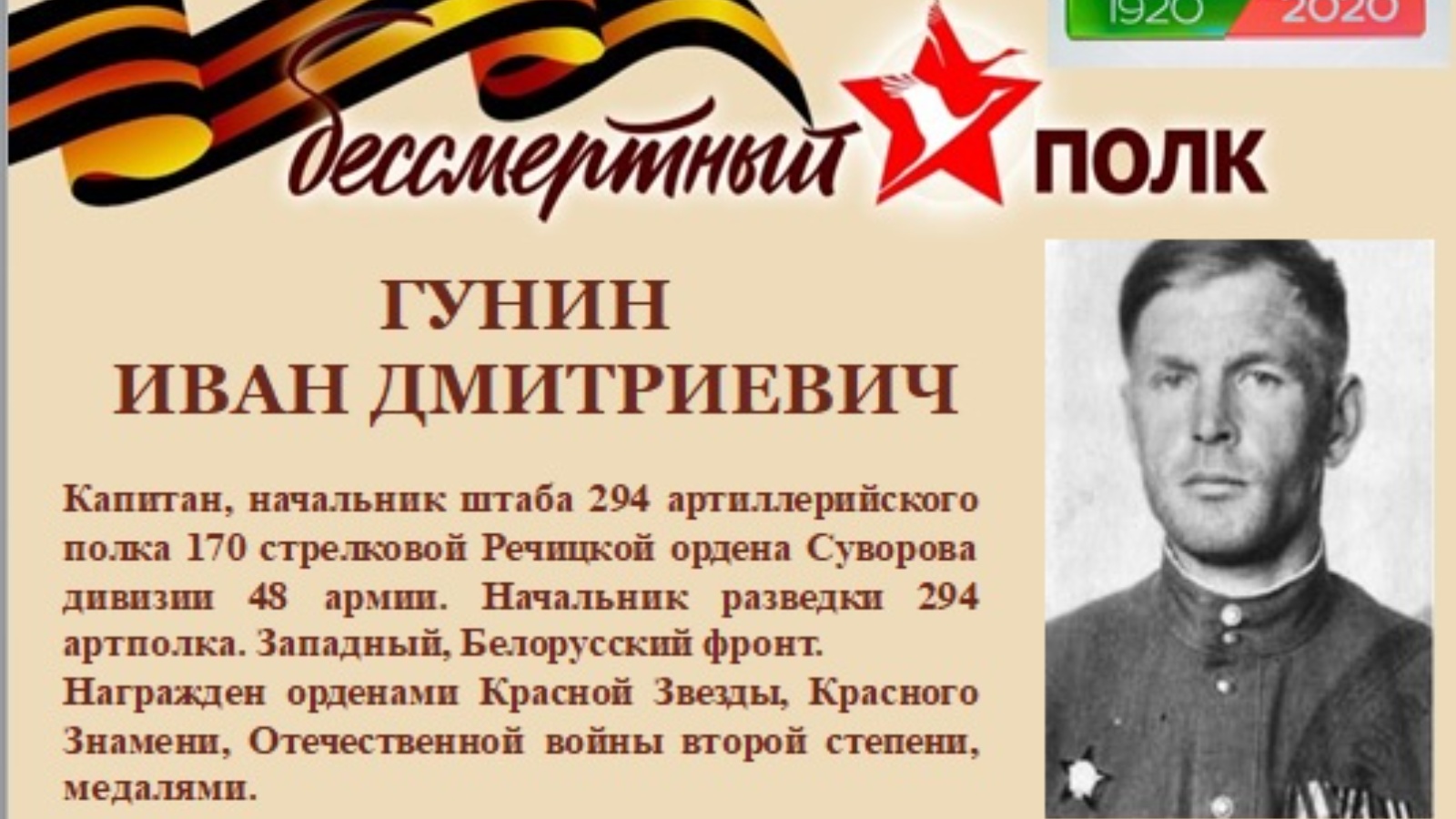 18.1.45 г. при прорыве 8-ми немецких танков на НП полка в районе предместья города Млава с десантом автоматчиков капитан Гунин с разведчиками полка открыл минометный огонь по десанту, убил из личного оружия 5 немецких автоматчиков и захватил 1 исправный танк. Достоин правительственной награды ордена Ленина».