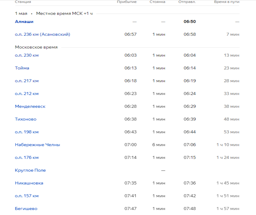По маршруту Алнаши — Заинск — Алнаши поезд ежедневно будет курсировать, отправляясь с железнодорожного вокзала Алнаши в 05:50 и прибывая в Заинск в 08:16. Обратно из Заинска будет отправляться в 16:14, прибывая в Алнаши в 18:55. На пути следования предусмотрены остановки: 236км (с. Асановский совхоз техникум), 230КМ (с. Русский Сарсаз), Тойма, 217 км (д. Максимково), 212 км (г. Менделеевск), Менделеевская, Тихоново (д. Салтыковка), 198 км (с. Тихоново), Набережные Челны, 176 км (с.н.т. «Рассвет» и «Силикатчик», пос. Кама), Круглое Поле, Никашновка, 157 км (д. Авлаш), Бегишево (с. Кер), Зыча (с. Буре-Сарай), 136 км (с. Старый Токмак).