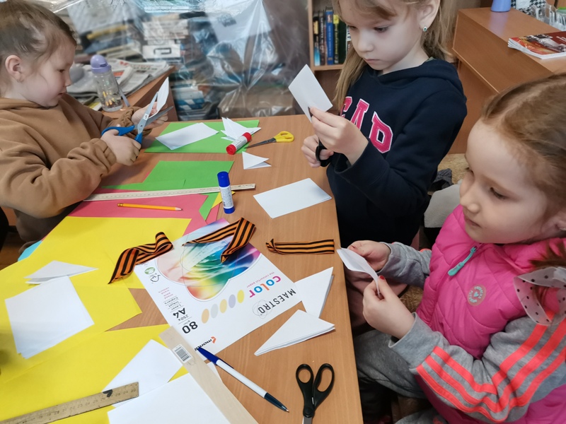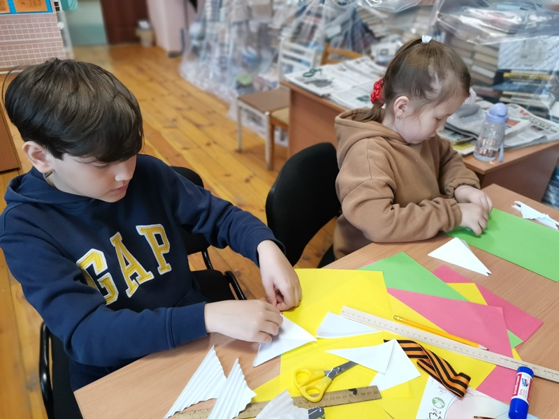 Библиотекарь научила детей делать открытки. В ходе работы библиотекарь рассказала о значении пятиконечной звезды, Георгиевской ленты, о празднике День Победы. Ребята очень постарались и открытки получились очень красивыми. Они обязательно понравятся ветеранам.