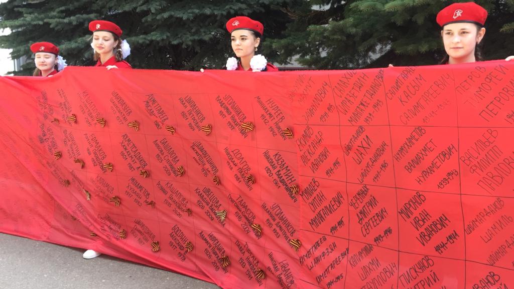 Учащиеся школы написали на красном полотне фамилии своих прадедов - участников Великой Отечественной войны». На площади перед школой было растянуто полотно, которое получилось длиной 84 метра. Минутой молчания участники митинга почтили память всех погибших на этой страшной войне.