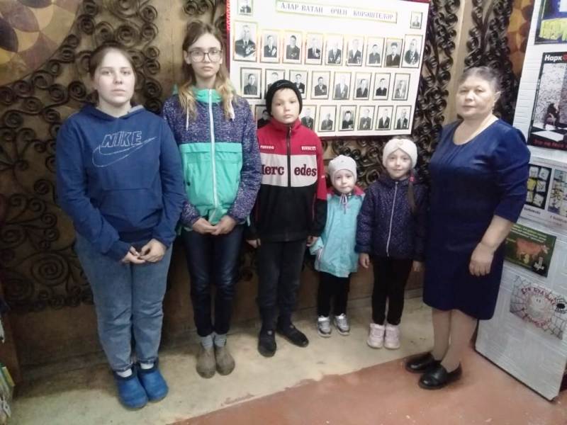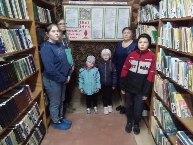 Библиотекарь рассказала о мужестве и героизме советского народа в годы Великой Отечественной войны. Дети показали на стенде «Алар Ватан өчен көрәштеләр» фотографии своих прадедов, которые сражались с врагами и вернулись с Победой в свою родную деревню. На стенде «Һәлак булган авылдашлар истәлегенә» прочитали фамилии и имена прадедов, которые погибли на войне. Дети вслух прочитали отрывки из книг А.Рафикова «От Калуги до Берлина», Ю. Иванова «Стоит деревушка…».