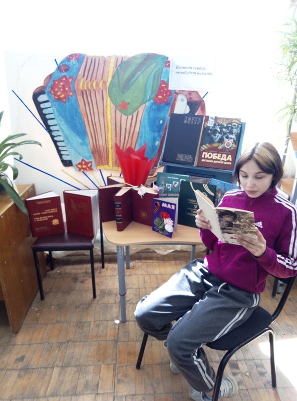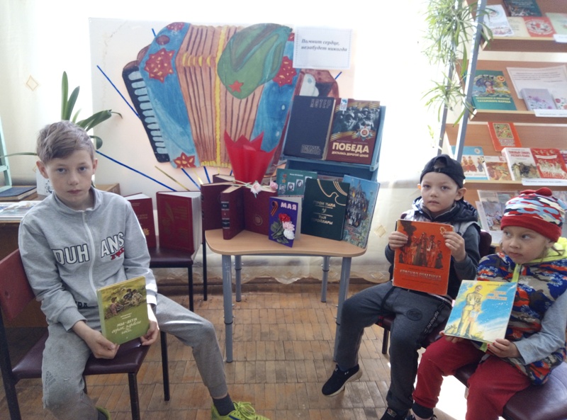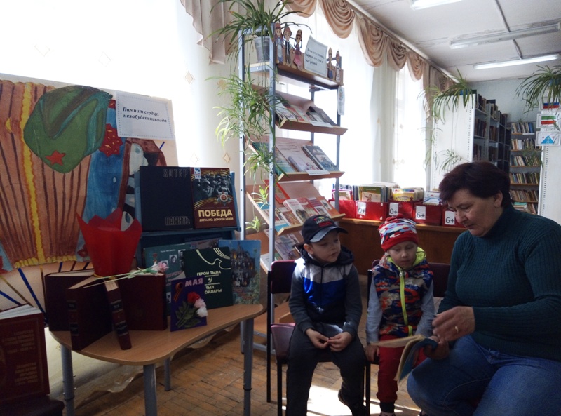 Участниками акции стали дети. В этот день, библиотекарь познакомила детей с произведениями о Великой Отечественной войне. Для чтения вслух были выбраны отрывок из повести Н. Надеждиной «Партизанка Лара», который прочитала выразительно одна из участниц акции и рассказ Д.Матвеева «Пилотка», который прочитала библиотекарь. После чтения этого рассказа дети охотно и с интересом отвечали на вопросы библиотекаря, делились своими впечатлениями, рассуждали о войне и рассказывали о своих родных и близких, которые были свидетелями военных лет. Для юных читателей была оформлена развернутая выставка «Помнит сердце, не забудет никогда», на которой были представлены книги о Великой Отечественной войне. Также детям были предложены книги Р.Мустафина «Красная ромашка», Д.Матвеева «Звезда на пилотке», М.Магдеева «Мы – дети сорок первого года». Наверно, никогда не наступит время, когда можно будет сказать, хватит, все уже сказано о Великой Отечественной войне, потому что нет меры трагизму войны, нет меры героизму людей и вечная память погибшим воинам.