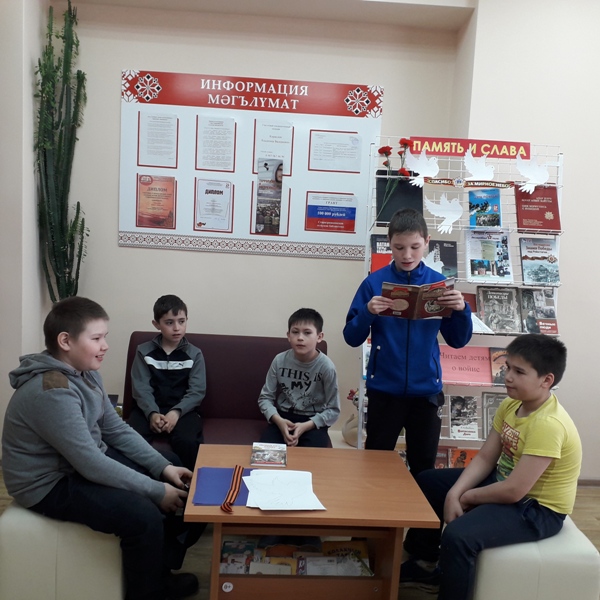 Библиотекарь Г.Бармакова поздравила участников акции – читателей младшего школьного возраста с наступающим праздником Днем Победы, познакомила ребят с книгой «Бессмертный полк: село Старое Гришкино». Затем читали рассказы из книги Печерской А.Н. «Дети - герои Великой Отечественной войны», отрывок из рассказа Л.Пантелеева «Платочек». Все ребята внимательно слушали, переживали вместе с героями, делились своими впечатлениями. Узнали о том как совсем юные герои войны наряду со взрослыми на фронте и в тылу приближали Победу. Пришли к выводу, что книги о войне нужно обязательно читать.