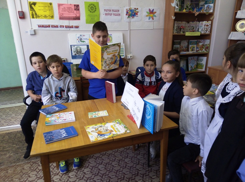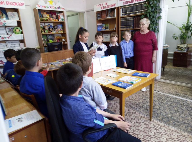 Библиотекарь познакомила ребят с биографией писателя, были прочитаны сказки «Нәни болан баласы», «Өр яңа әкитләр», «Фил малае Зурколак». Была подготовлена книжная выставка «Өр – яңа китаплар».