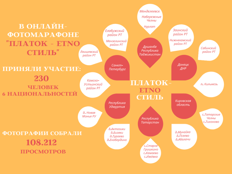 Межрегиональный онлайн-фотомарафон объединил 230 участников из разных регионов страны и ближнего зарубежья: Республика Таджикистан, Донецкая Народная республика, Республика Удмуртия, Республика Татарстан, Кировская, Самарская области, Санкт-Петербург. Более 600 фотографий, присланных организаторам, показали, что любовь к платку, как к символу женской красоты, мудрости существует и живет в народе по сей день. Более того, как элемент национального костюма, платок, популярен среди подрастающего поколения. ETNO стиль объединил русских, татар, удмуртов, марийцев, кряшен, азербайджанцев возрастом от 1 года до 80 лет. В сети ВК на странице Центральной библиотеки с марта по май месяц фотографии участников набрали 108212 просмотров и это количество с каждым днем только растет.
