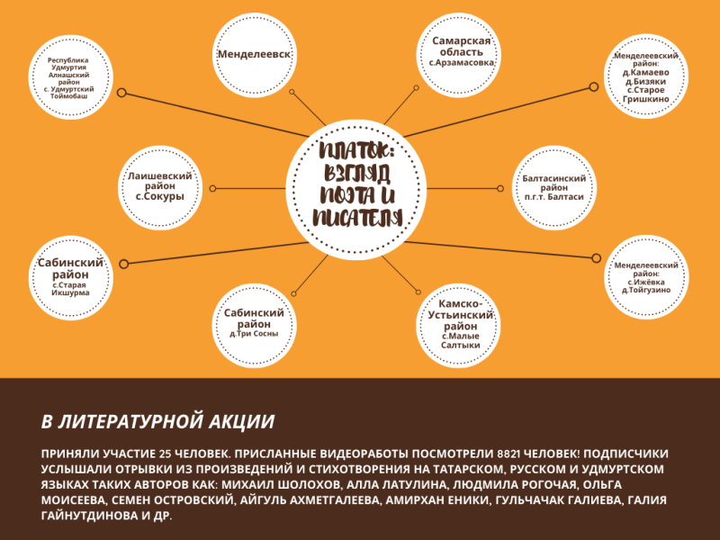 Межрегиональная сетевая литературная акция познакомила пользователей сети ВК с отрывками из произведений и стихотворениями таких авторов как: Михаил Шолохов, Алла Латунина, Людмила Рогочая, Ольга Моисеева, Галия Гайнутдинова, Гульчачак Галиева, Амирхан Еники и др. Удивительный мир платков и его красоту воспели участники акции на русском, татарском, удмуртском языках. Видео участников из Самарской области, Республики Удмуртии, Балтасинского, Сабинского, Лаишевского, Камско-Устьинского районо Республики Татарстан посмотрели 8821 человек.