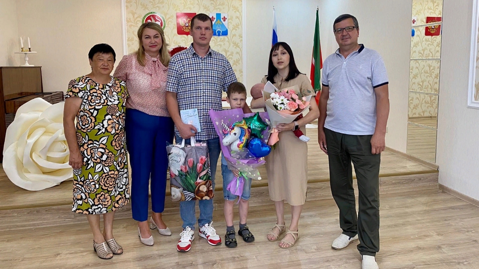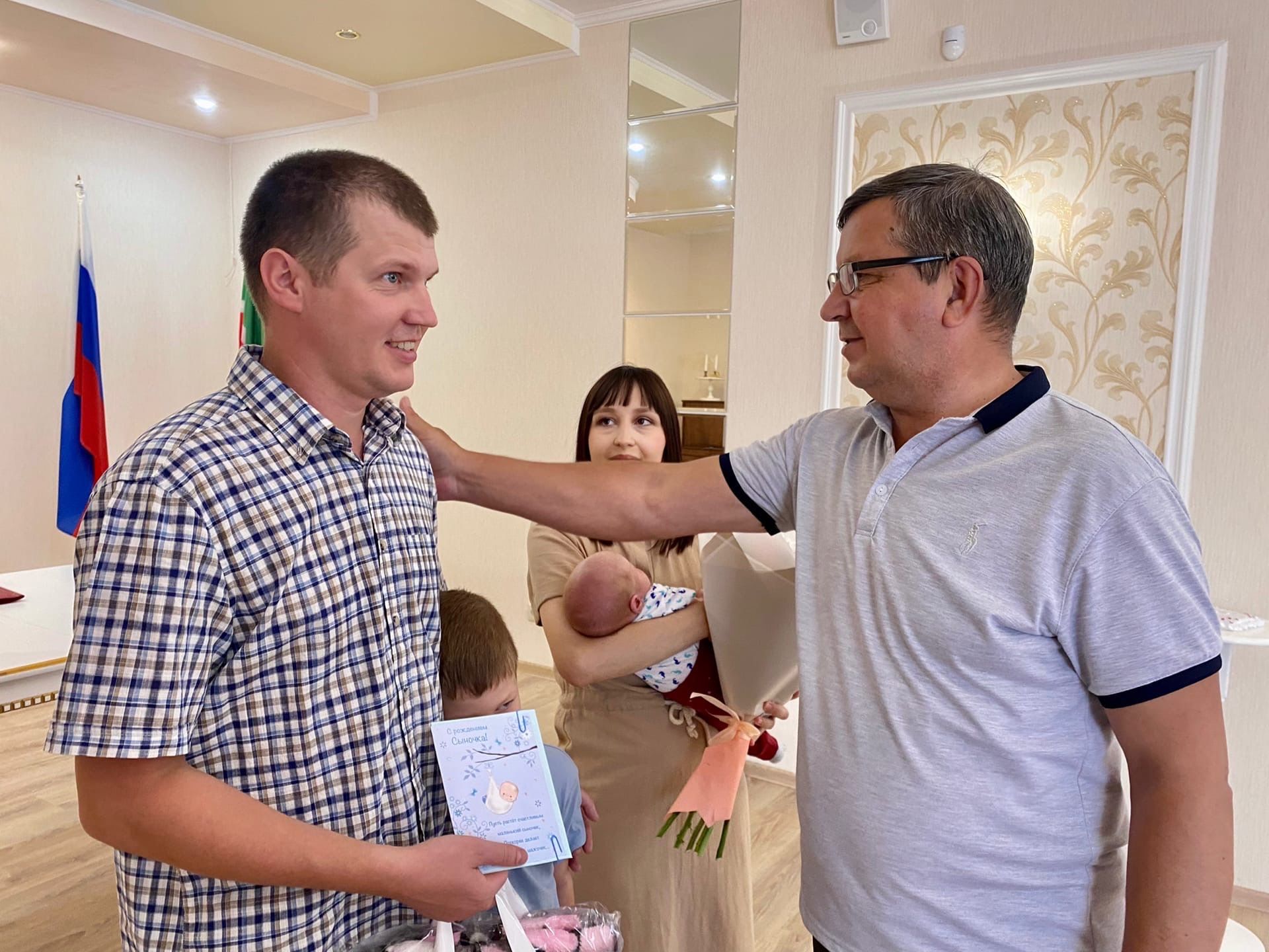 В торжественной обстановке отдела ЗАГС района семью Аркадия и Ларису Леоновых с рождением второго сына поздравили начальник ЗАГСа Татьяна Алексеева, депутат городского совета Райхан Сабирзянов и председатель ТОС «Карповец» Гульсина Загрутдинова.