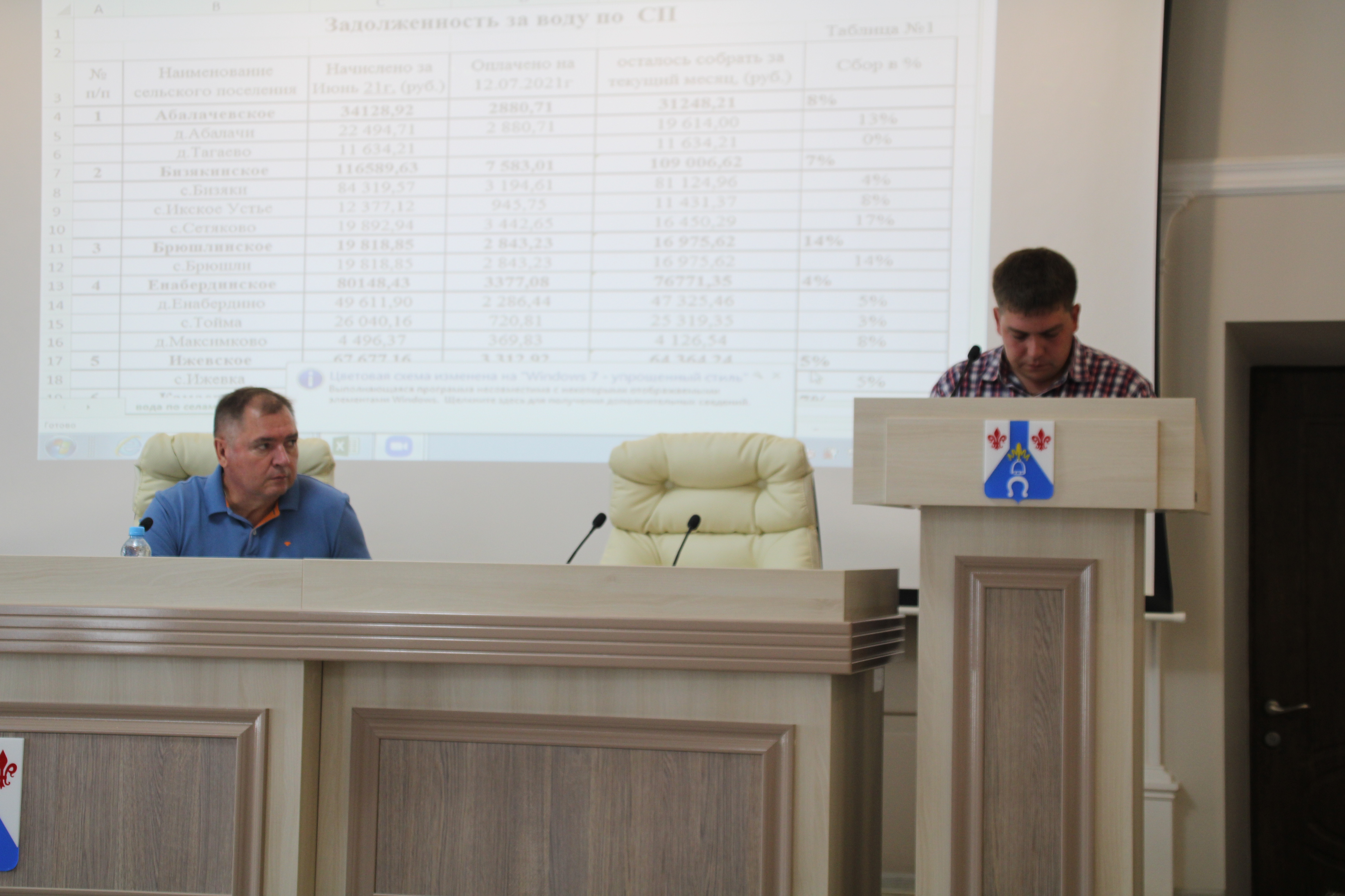 Начальник отдела строительства и ЖКХ Павел Лизунов доложил о начислении и оплате за поставку воды и вывоз твердых бытовых отходов в разрезе сельских поселений по состоянию на 13.07.2021г. В Ижевке будет произведен покос травы возле МКД, устранение порыва в Ст.Гришкино. В Управляющую компанию за неделю поступило 42 заявки, все решены.