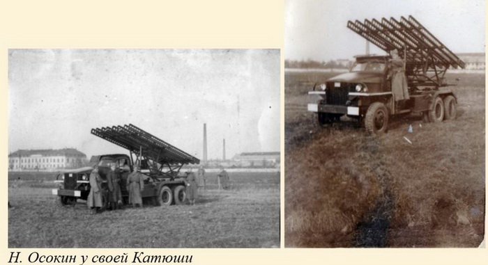 Из воспоминаний Осокина Н.Н.: «Тайна Катюши состояла в том, что это было первое ракетное оружие. Отличалась тем, что стреляла Катюша не минами, а ракетами. Устроена ракета у «Катюши» была очень просто: длинная труба, в ней пороховой метательный заряд в виде цилиндрических шашек. Впереди навинчивался сам снаряд, 21 кг. А всего ракета весила 49 кг. Когда снаряд разрывался, коснувшись цели, ракетная труба отрывалась и, крутясь в воздухе, летела метров на 50, создавала такой звук, который заставлял врага просто из-под земли вылезать.