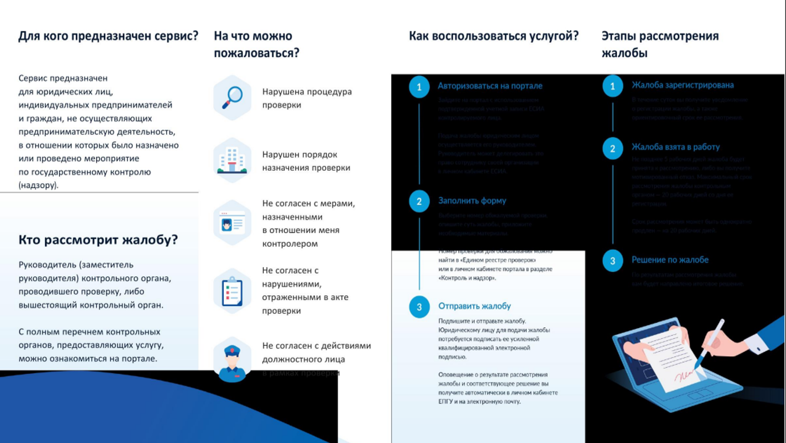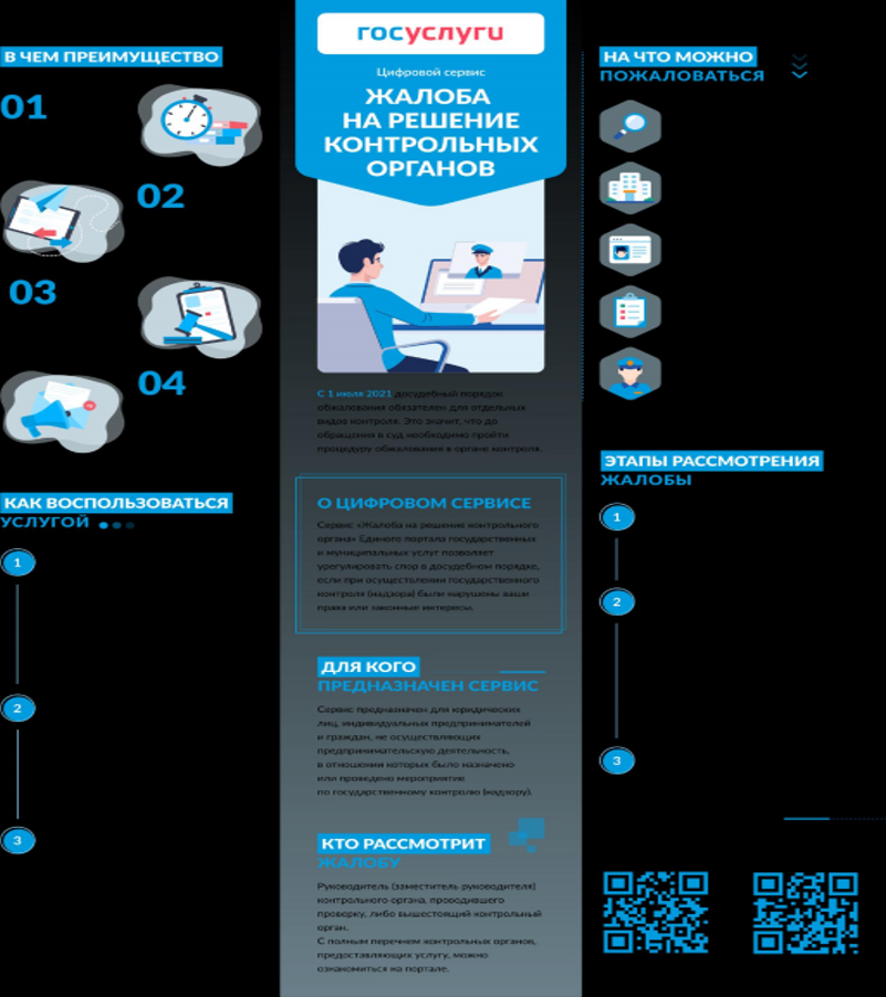 Сервис «Жалоба на решение контрольного органа» Единого портала государственных и муниципальных услуг позволяет урегулировать спор в досудебном порядке, если при осуществлении государственного контроля (надзора) были нарушены ваши права или законные интересы.