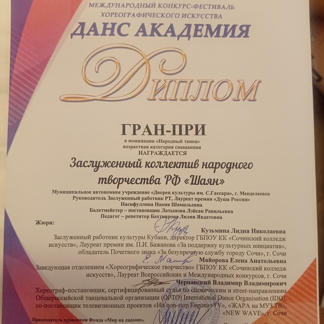 — Жюри были восхищены таким исполнением и подачей народной хореографии. Была высоко отмечена грамотная постановка и сюжет композиций, которые так ярко передали традиции и обычаи наших народностей, а качественное исполнение и эмоции детей поставили окончательную точку в решении жюри. "Шаян" стал обладателем ГРАН-ПРИ, а также получили приглашение на Суперфинал "Кубок России" в Москву-поделилась директор Дворца Культуры им.С.Гассара Лэйсан Латипова.