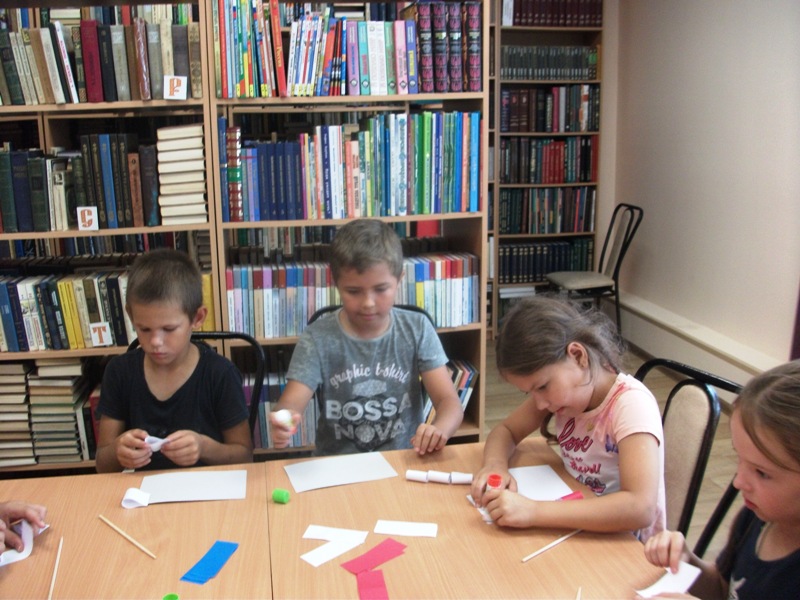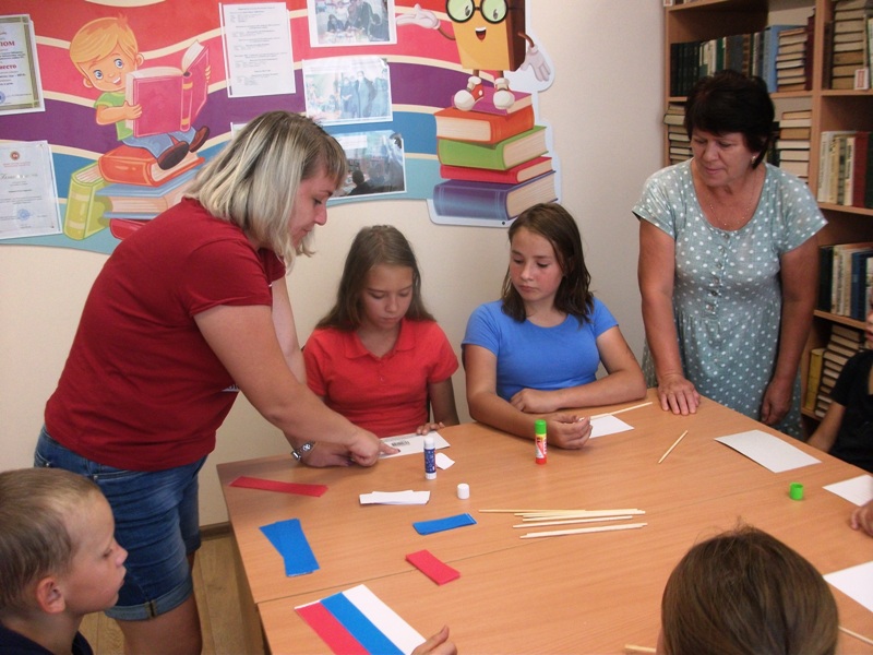 В библиотеке была подготовлена познавательная выставка – викторина «Белый, синий, красный цвет – символ славы и побед». Ребята познакомились с удивительной историей возникновения и утверждения триколора, активно отвечали на вопросы викторины о символах нашей Родины, познакомились с книжной выставкой. Следующим этапом мероприятия стал мастер-класс по изготовлению флажков, подготовленный сотрудниками СДК. Ребята с гордостью шли к памятнику погибшим воинам в Великой отечественной войне, поднимая над головой флажки, сделанные своими руками. У памятника был развернут флаг России и минутой молчания почтили память погибших.