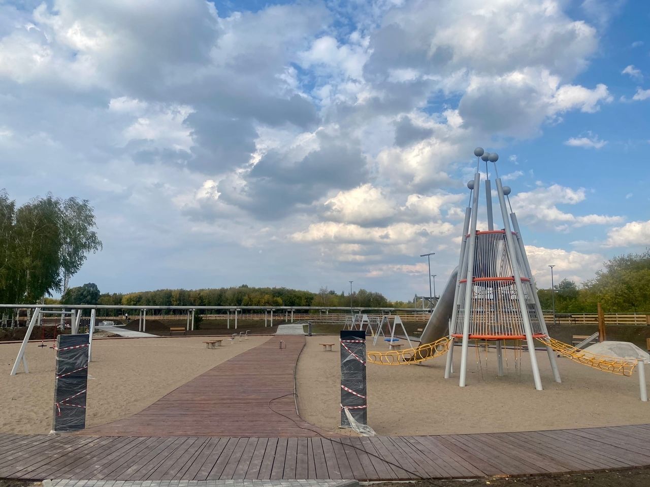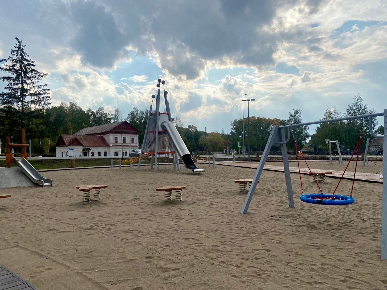 В новой части парка проложена брусчатка, построена прогулочная зона возле реки Тойма, завезен песок на детскую площадку, установлены малые архитектурные формы: горка, качели. Установлены новые современные скамейки.
