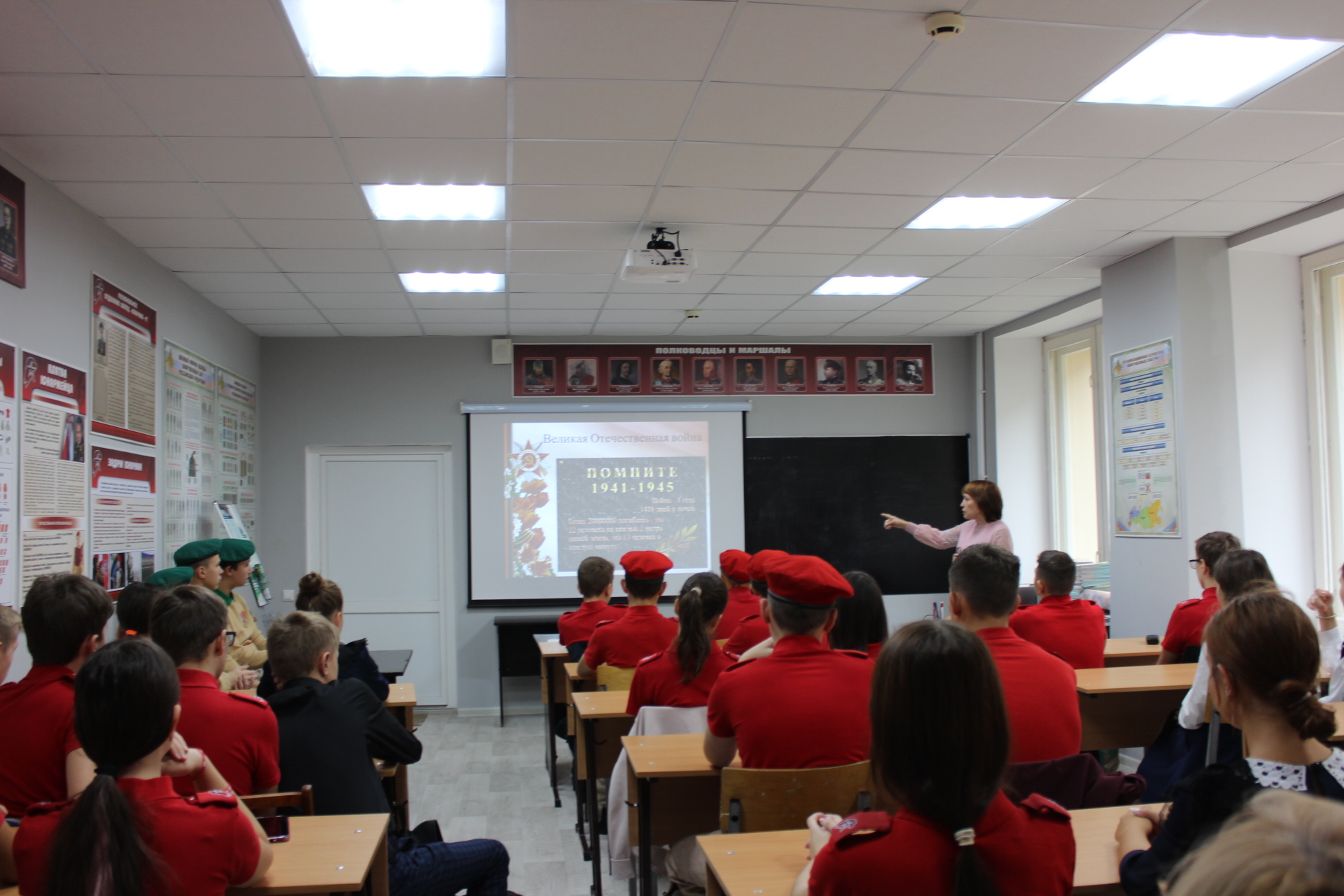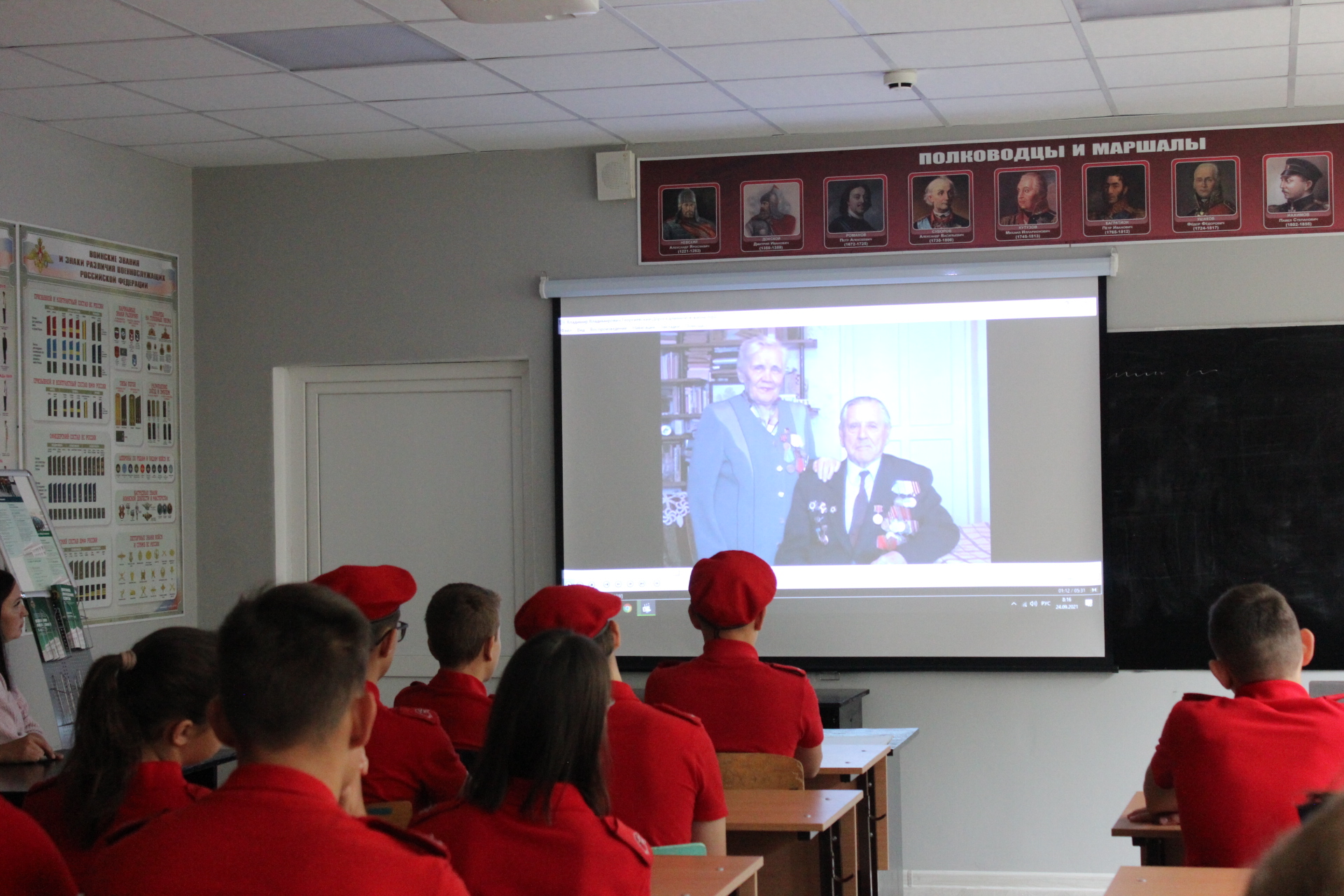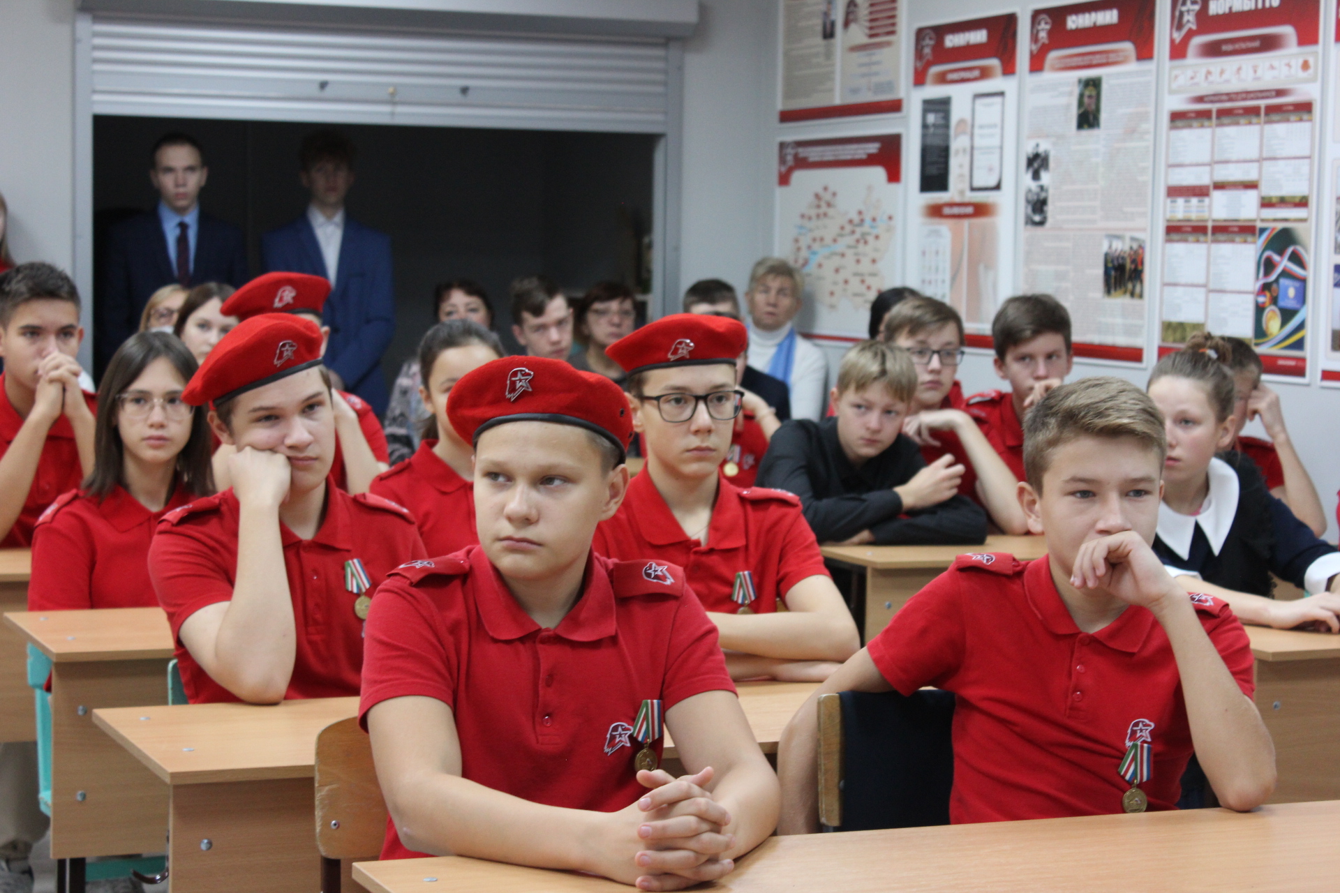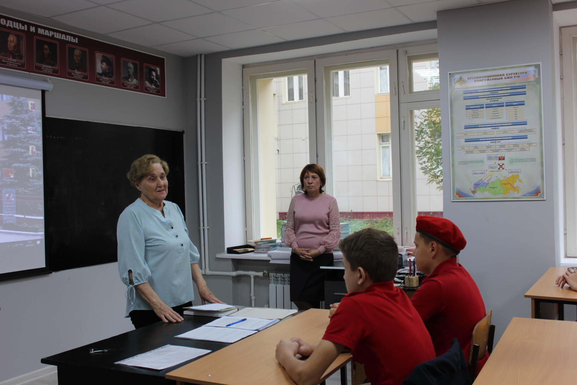 Урок Мужества посетили члены Совета ветеранов ММР. Также перед учащимися выступили заместитель директора по воспитательной работе Людмила Ярославцев, почетные гости - дочери Владимира Владимировича - Людмила и Марина, правнук Максим.Для юнармейцев был организован показ фильма, посвящённого В.В. Георгиевскому. Также в этот день прошло торжественное открытие стены памяти с портретами М.С. Фомина и В.В. Георгиевского. Закончилось мероприятие возложением цветов к памятнику Героя.