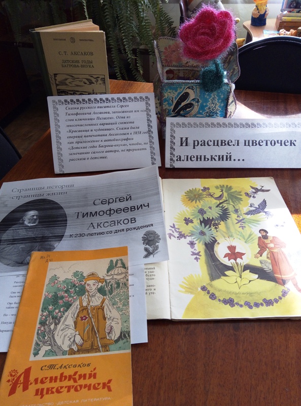 К мероприятию была подготовлена и оформлена книжная выставка «И расцвел цветочек аленький». Дети познакомились с творчеством писателя и узнали историю создания сказки «Аленький цветочек».