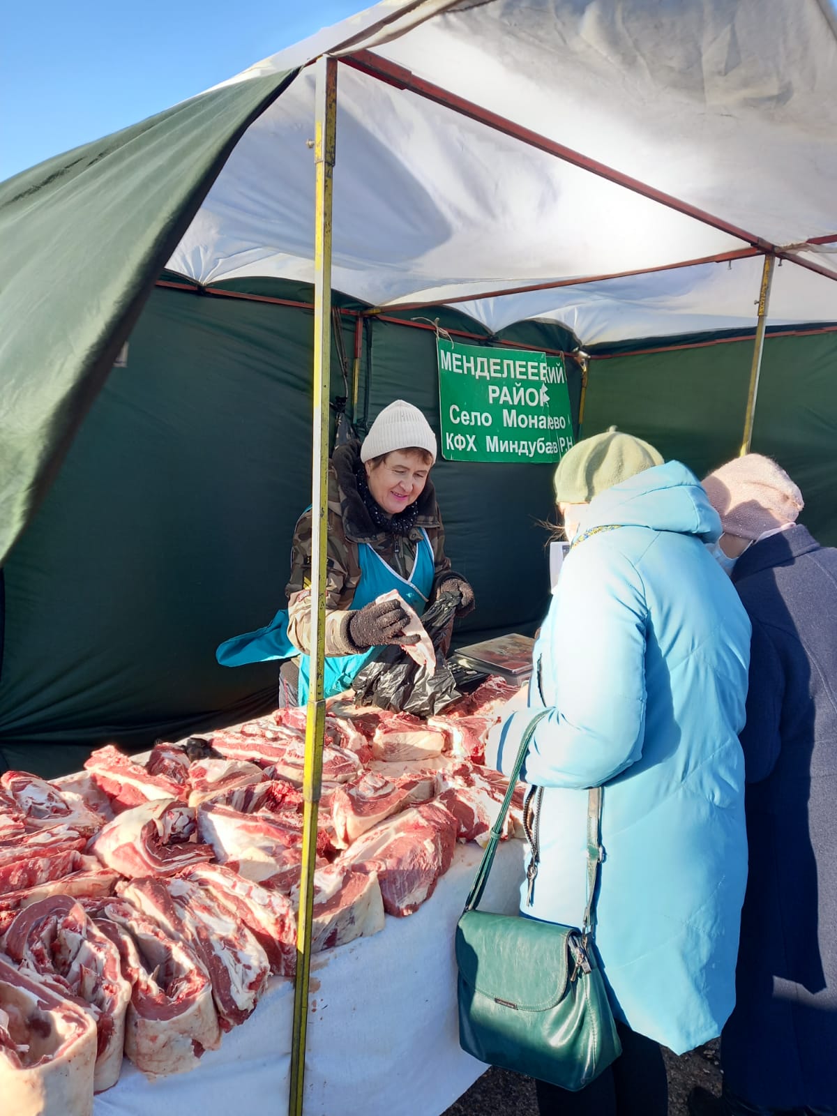 От Менделеевского района в ярмарке приняли участие КФХ Миндубаев - 3 точки с мясом говядины, ООО "Первомайка" - продажа свинины в 2 точках, ЛПХ Созонов - продажа картофеля и ЛПХ Ибрагимов - продукты пчеловодства, КФХ Сейталиев - картошка, мясо птицы и яйца.