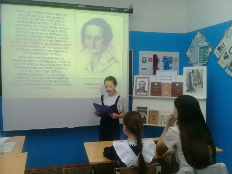 Учительница русского языка Зигангареева А.С. познакомила учащихся с интересными фактами из биографии и творчества великого писателя. Учащиеся 7-10 классов кратко рассказали о его знаменитых произведениях "Преступление и наказание, "Бедные люди", "Идиот", «Униженные и оскорбленные». Библиотекарь Псеевской сельской библиотеки Яраханова Рузалия сделала обзор книжной выставки, познакомила с интересными цитатами и высказываниями Ф.М. Достоевского.