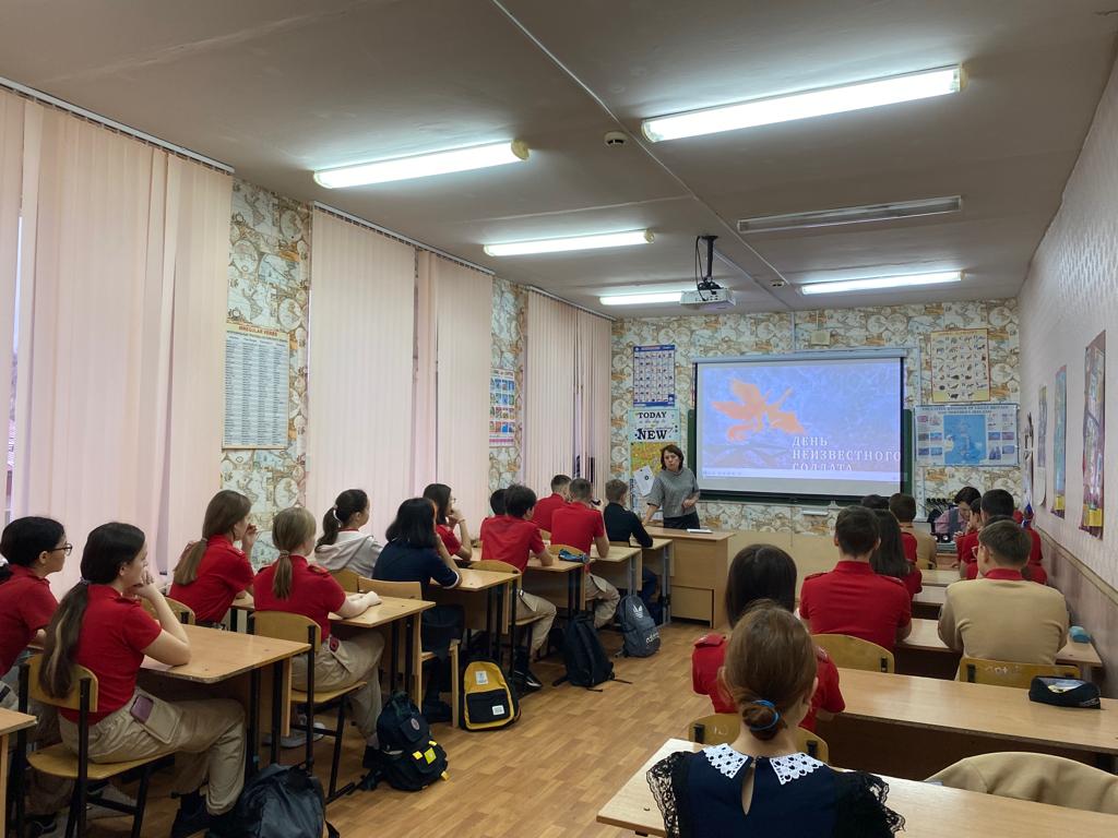 Во всех классах одновременно прошли классные часы, посвященные Дню неизвестного солдата. Ребятам были представлены исторические сведения об этом дне, также были показаны документальные кадры из истории Великой Отечественной войны.