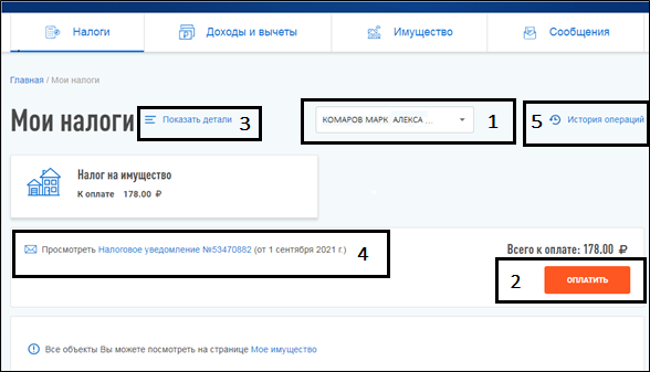 Дополнительно сообщаем, что раздел «Мои налоги» при оплате за ребенка, функционирует без изменений. Возможность оплаты осуществляется кнопкой «Оплатить» (2), посмотреть детали начислений в «Показать детали» (3), просмотр документа-основания (4), история операций (5).