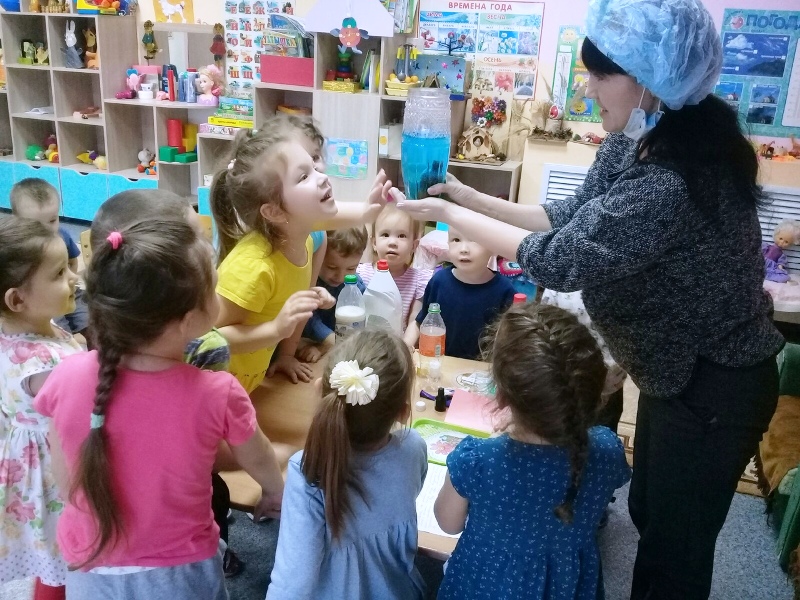 В ходе мероприятия ребятишки познакомились с книгой Лины Штиссель "Из чего сделано все живое?", где умный Мышонок рассказывает «что такое клетки, какими они бывают и что делают?», «как зародилась жизнь на Земле?», «как всего из двух клеточек развивается человек». Малыши с интересом слушали, задавали умные вопросы, участвовали в беседе. Затем библиотекарь для любопытных ребят провела простые, но очень интересные и занимательные опыты :"Подводный вулкан", "Цветное молоко", "Извержение вулкана", "Самонадувающийся шарик". Маленькие почемучки были в восторге от опытов. Мероприятие было увлекательное и познавательное.