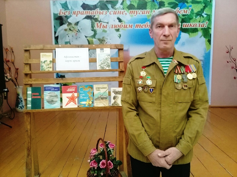 Была оформлена книжная выставка «Афганистан – йөрәк ярасы». Посмотрев видеофильм, ребята узнали о начале военного конфликта и о выводе ограниченного контингента советских войск с территории Демократической Республики Афганистана. Главным героем мероприятия был Фаттахов Ришат Касимович, который с честью выполнил свой интернациональный долг и выдержал военные испытания, проявляя при этом свои лучшие качества. Он поделился своими воспоминаниями о службе в составе ограниченного контингента советских войск во время Афганской войны. Мероприятие закончилось минутой молчания.