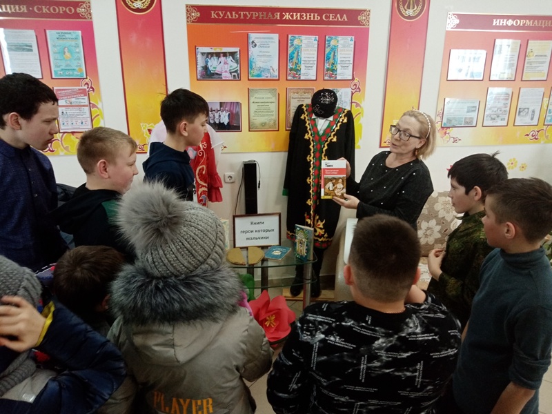 Мальчики и девочки с большим удовольствием участвовали в мероприятие. После лыжни ребят угощали чаем и блинами. А библиотекарь Г. Галимуллина подготовила выставку «Книги, герои которых мальчики». Были подобраны книги, отражающие мужество, благородство, честь и отвагу сильной половины человечества. Во время проведения обзора ребята получили ответы на интересующие их вопросы. Прочитав эти книги, наши мальчишки смогут взглянуть на себя со стороны и найдут ответы на свои вопросы, и быть может, почерпнут для себя что-то новое, ведь героем может стать любой мальчишка, совершая подвиги в повседневной жизни.