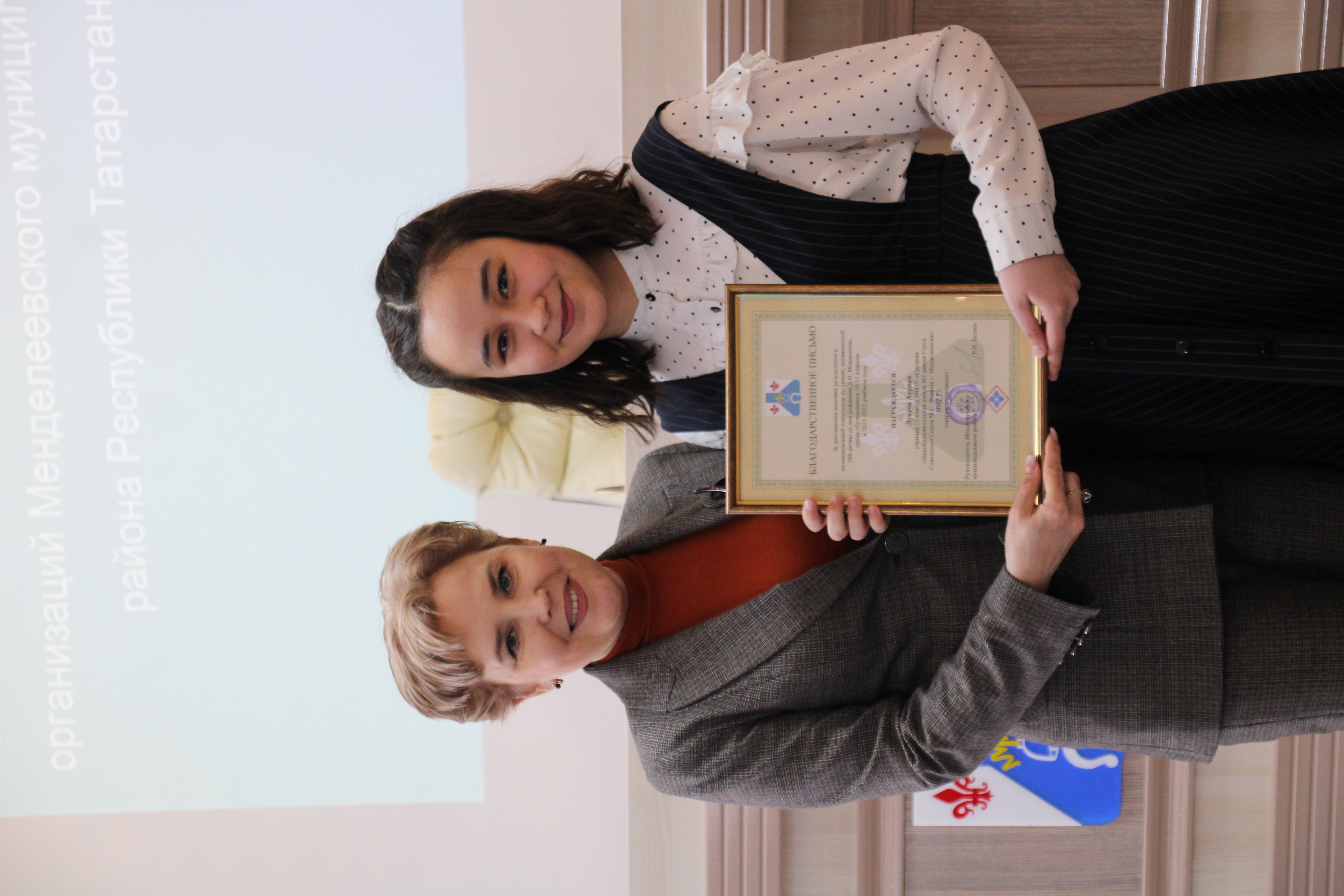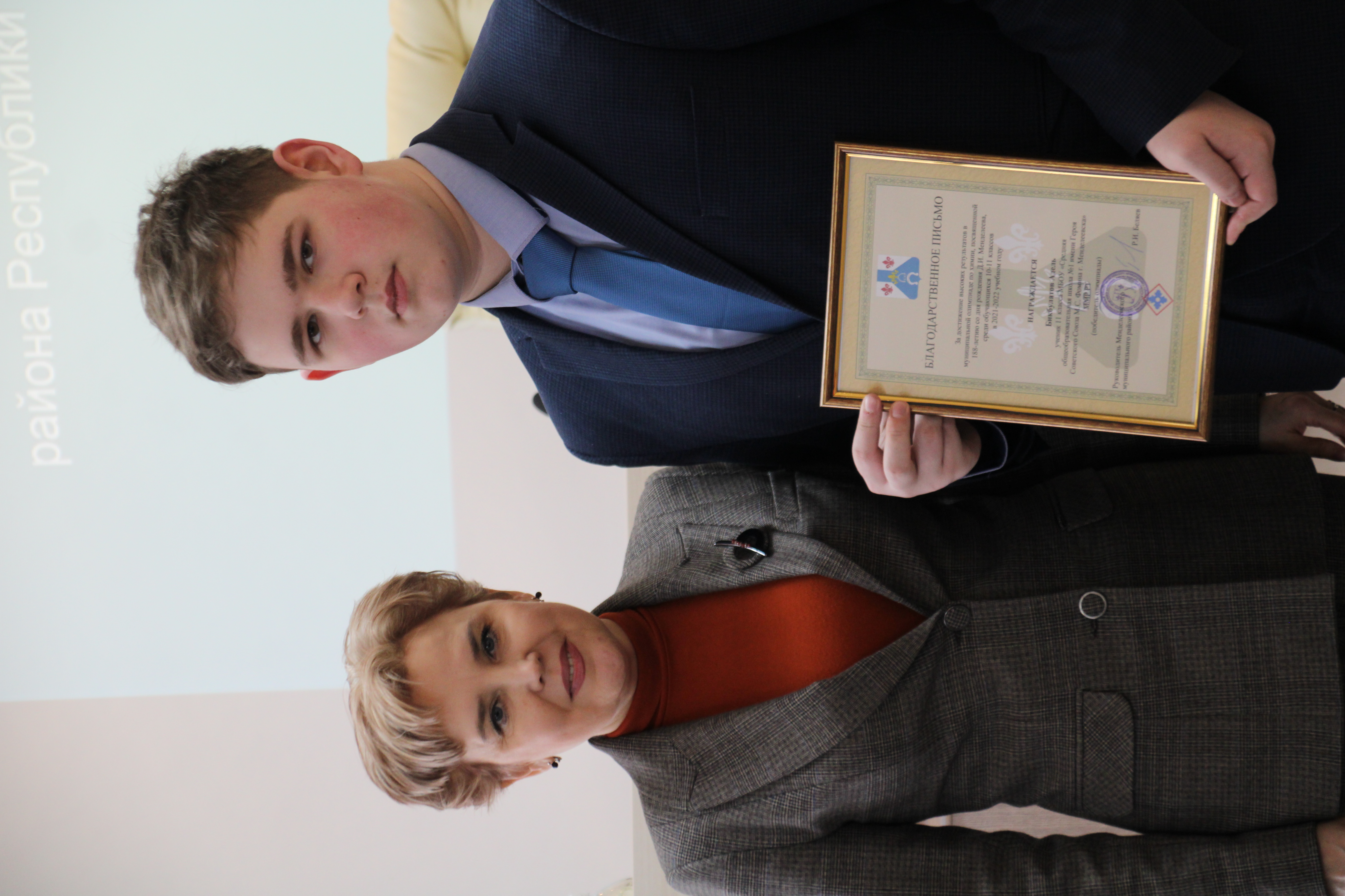 Далее Благодарственным письмом руководителя района за достижение высоких результатов в муниципальной олимпиаде по химии, посвященной 188-летию со дня рождения Д.И. Менделеева, среди обучающихся 10-11 классов в 2021-2022 учебном году, были награждены учащиеся 11 класса средней общеобразовательной школы №1 имени героя Советского Союза М.С. Фомина г. Менделеевска: