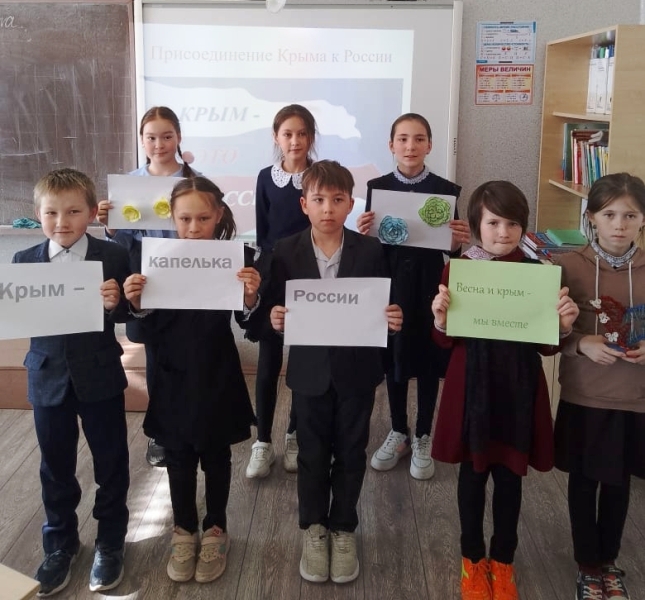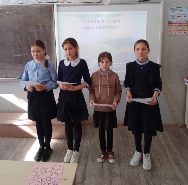 Ребята посмотрели презентацию "Россия и Крым – мы вместе!". Библиотекарь познакомила ребят с историей полуострова, с его достопримечательностями, напомнила ребятам страницы истории героической обороны города Севастополя в годы Великой Отечественной войны. Учащиеся 4 класса подготовили сообщения о Крыме, рассказали стихи. В продолжение мероприятия ребята изготовили аппликации из бумажных цветов.