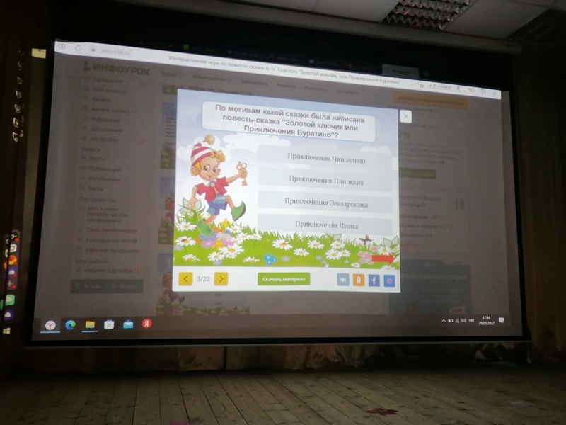 Дети вместе с библиотекарем Н.В Ахмедовой совершили увлекательное литературное путешествие по страницам знаменитой книги А.Н. Толстого. В ходе мероприятия ребятам предстояло пройти интересные испытания в игре-викторине, чтобы выиграть удивительный приз – знаменитый «Золотой ключик», которым можно открыть дверь в замечательную страну знаний. В конце мероприятия был устроен показ мультфильма «Приключения Буратино».