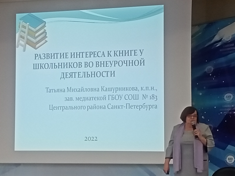 Во второй части конференции прошла творческая встреча с Кашурниковой Татьяной Михайловной, автором учебного пособия «Чудо, имя которому – книга», кандидатом педагогических наук, почетным работником общего образования РФ, библиотекарем – библиографом, руководителем медиатеки ГБОУ СОШ №183 Центрального района Санкт – Петербурга. Участники и гости получили возможность лично познакомиться и пообщаться с автором издательства «Русское слово».