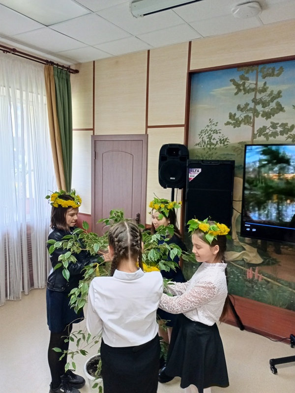 Так как 2022 год объявлен Годом культурного наследия народов России, мероприятии проходили под девизом «ПроТрадиции». Библиотекари Казакова Л.М. и Назарова Е.А. рассказали гостям встречи о празднике Троица, который проводится на пятидесятый день после Пасхи. В этом году он выпадает на 12 июня. Раньше этот праздник называли праздником русской березы. Величание берёзки на Руси было обязательным обрядом. Вокруг березки было принято заводить хоровод. В этот день девушки брали с собой угощенье и шли в лес, где находили красивую берёзку, завязывали на её ветвях ленточки, кланялись ей и просили выполнить их желания. А ещё в этот день принято было плести венки из цветов, загадывать желания и бросать их в воду. Если венок поплыл, значит, желание сбудется. Ребята с удовольствием загадывали желания и привязывали ленточки к берёзке, плели венки, отгадывали