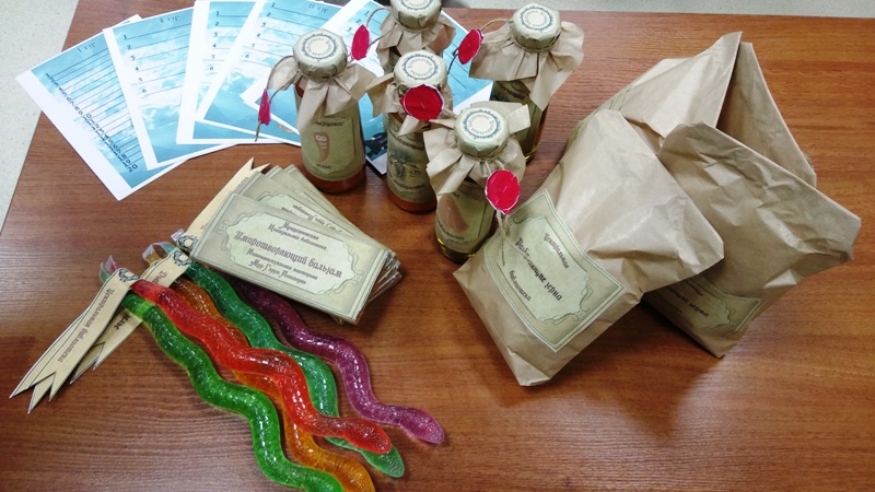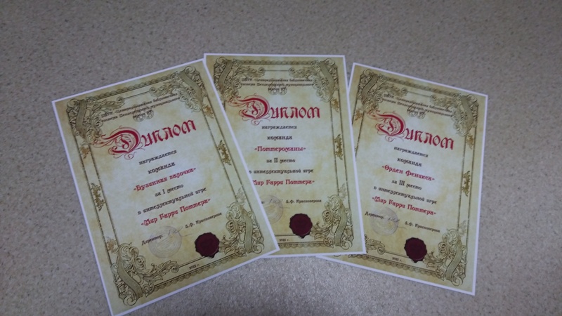Участники мероприятия - дети и взрослые, поделившись на четыре команды: «Бузинная палочка», «Поттероманы», «Орден Феникса», «Солнечный отряд» с огромным интересом отвечали на вопросы 5 туров ведущего и постоянного читателя Радика Гиниатуллина. В завершении мероприятия директор поблагодарила всех участников за игру, вручив победителям и всем участникам дипломы и призы.