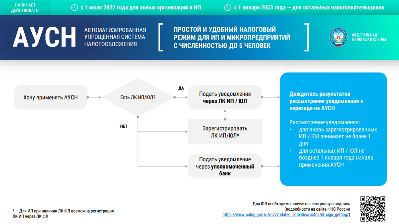 С 1 июля 2022 года на АУСН смогут перейти все новые индивидуальные предприниматели и организации, а с 1 января 2023 года – остальные ИП и ЮЛ. Переход добровольный