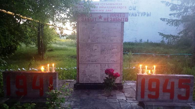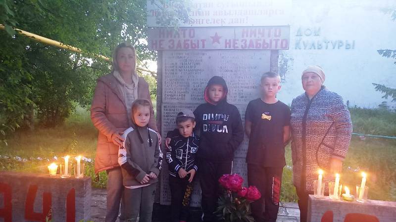 Началась акция у памятника погибшим воинам, у которого директор СДК и библиотекарь вместе с односельчанами зажгли свечи. Библиотекарь рассказала участникам, что эта акция — дань уважения подвигу советских солдат, всех наших соотечественников, погибших в годы Великой Отечественной войны. Каждый желающий мог зажечь свечу, отдав дань уважения тем, кто обеспечил нам мирную жизнь. После этого дети в библиотеке вместе с библиотекарем и директором СДК читали рассказы о войне из книги А.Рафикова "От Калуги до Берлина".