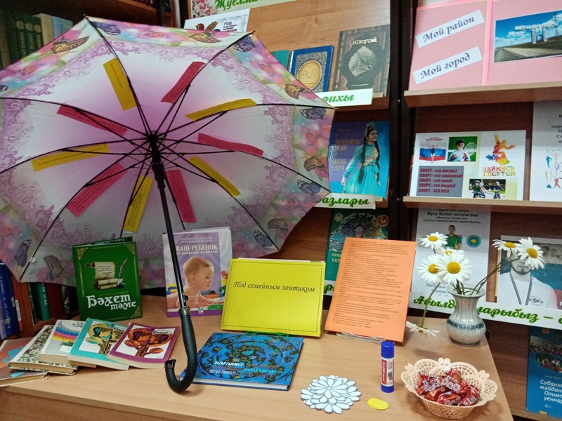 К этому дню в Камаевской сельской библиотеке подготовлена выставка – обзор «Под семейным зонтиком». На выставке представлены материалы об истории праздника, книги о роли семьи и построения семейных отношениях, книги о семейном досуге. Читателям предложена семейная викторина «Ромашка счастья». Участники получили сладкий приз с наклейкой-ромашкой.
